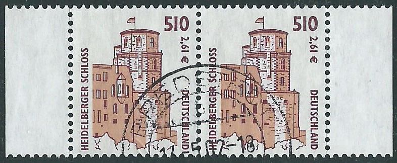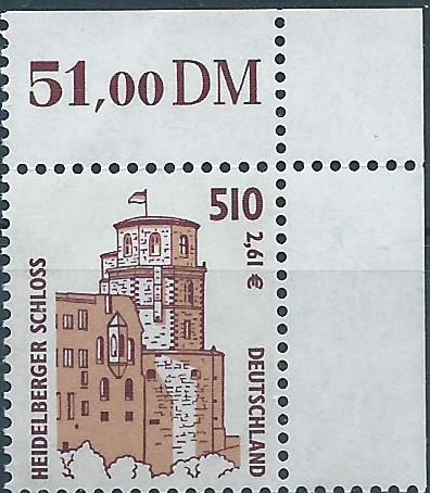Am 8.11.2001 wurde die Marke zu 510Pf/2,61 € verausgabt, sie zeigt als Motiv das Heidelberger Schloss. Hier eine Marke vom linken unteren Bogenrand: