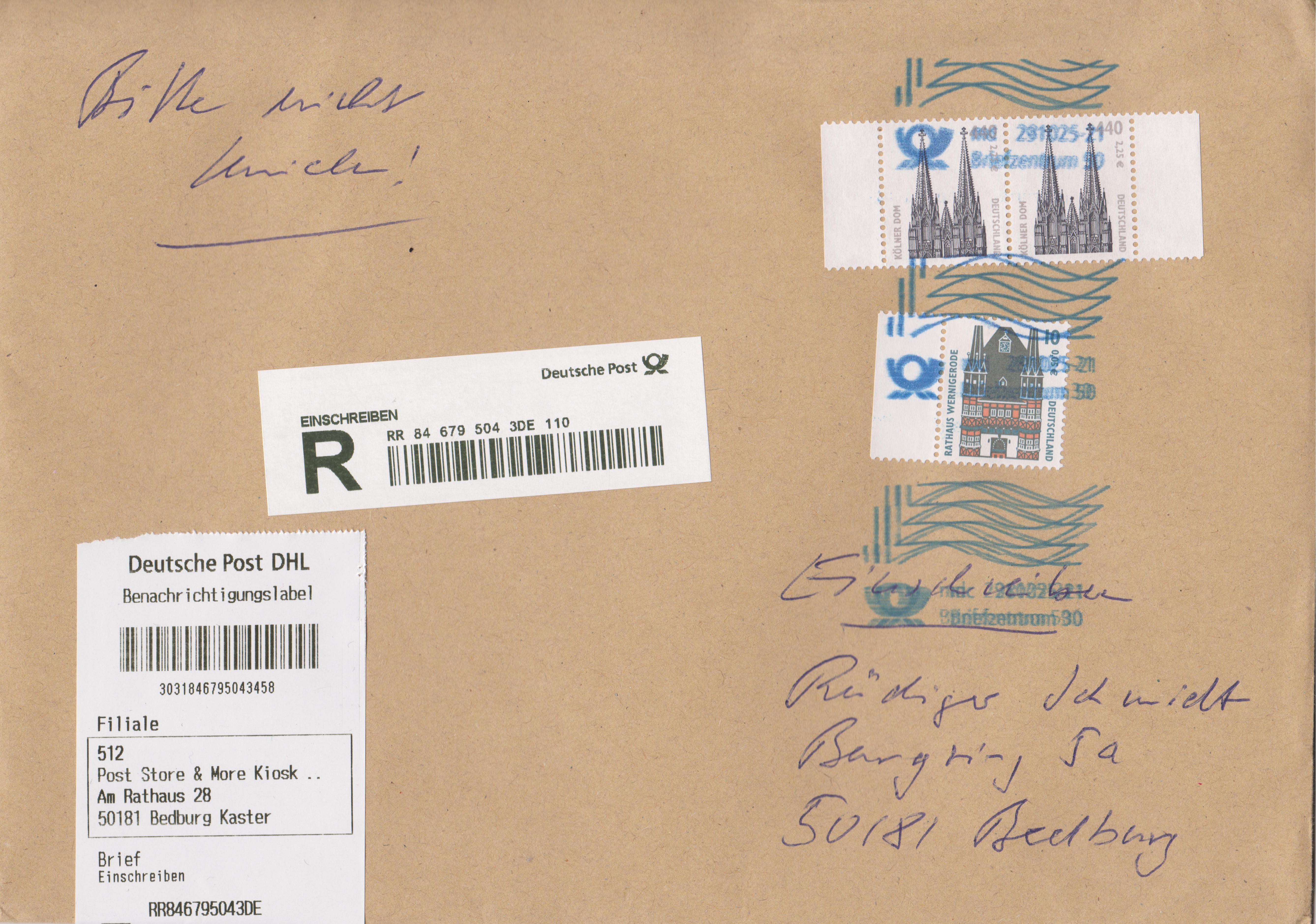 Paar der MiNr. 2206 als Teil iner Mischfrankatur auf einem Brief per Einschreiben: