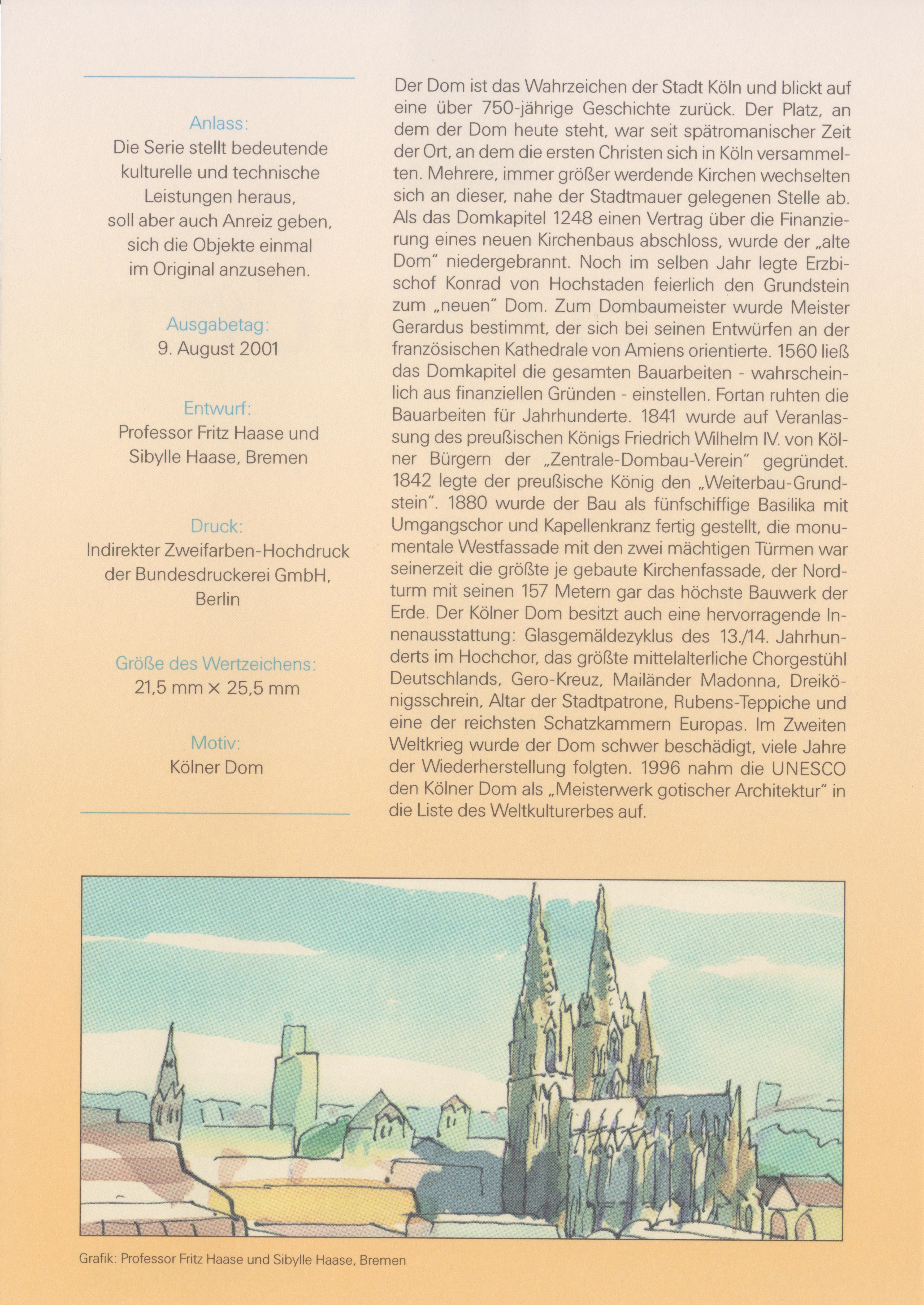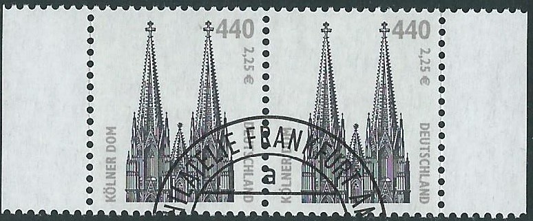 Am 9.8.2001 wurde die Marke zu 440Pf/02,25 € verausgabt, sie zeigt als Motiv den Kölner Dom. Hier eine Marke vom linken unteren Bogenrand: