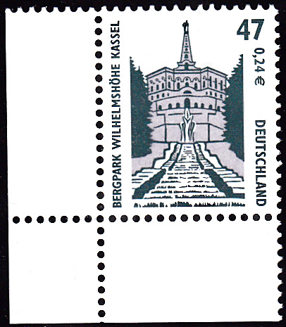 Am 5.4.2001 wurde die Marke zu 47Pf/0,24 € verausgabt, sie zeigt als Motiv den Bergpark Wilhelmshöhe in Kassel. Hier eine Marke vom linken unteren Bogenrand: