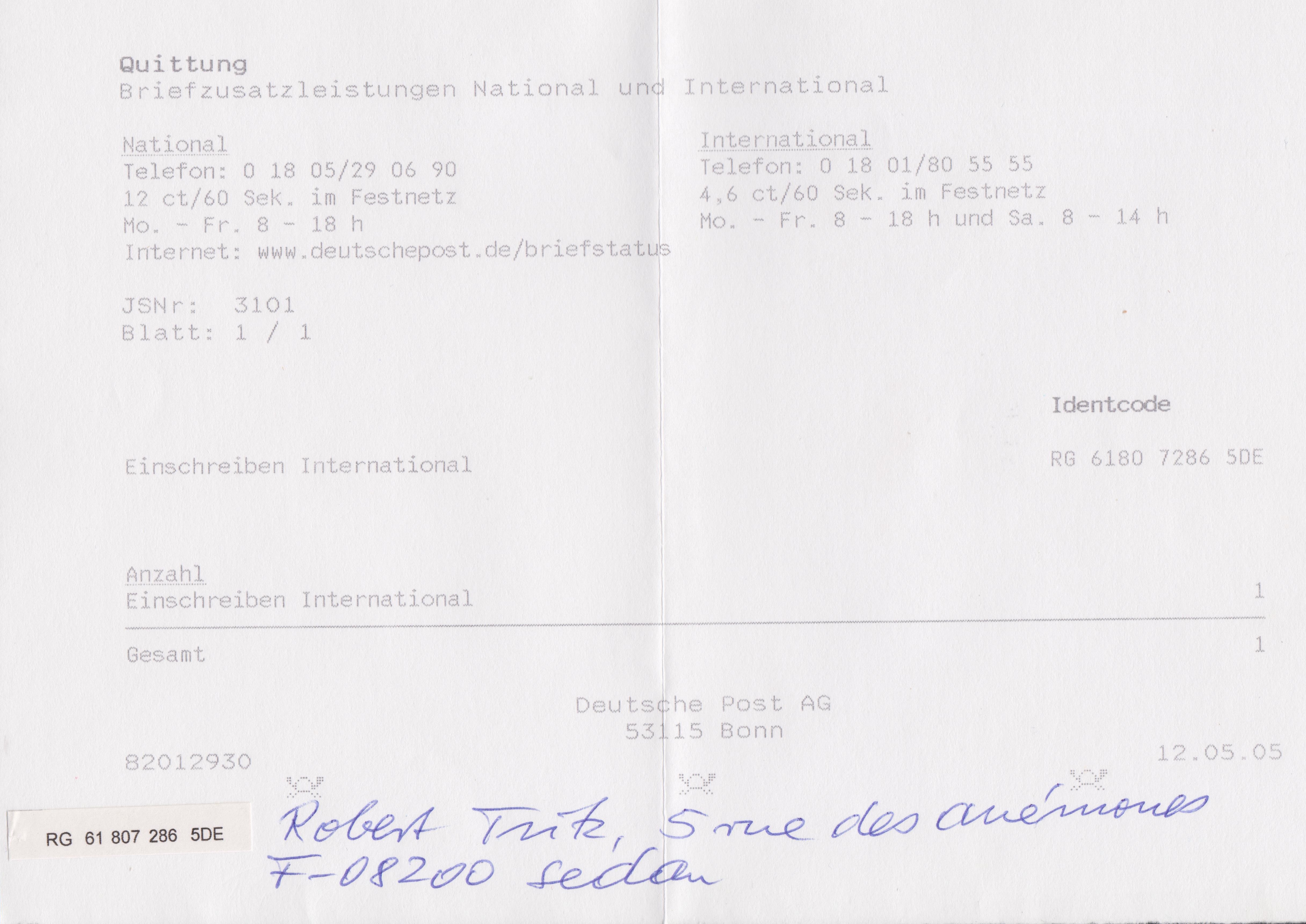 Die Quittung zu der Aufgabe dieses Beleges am Postschalter in BONN liegt mir ebenfalls vor: