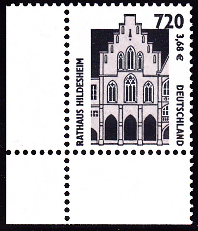 Am 2.7.2001 wurde die Marke zu 720Pf/3,68 € € verausgabt, sie zeigt als Motiv das Rathaus in Hildesheim. Hier eine Marke vom linken unteren Bogenrand:
