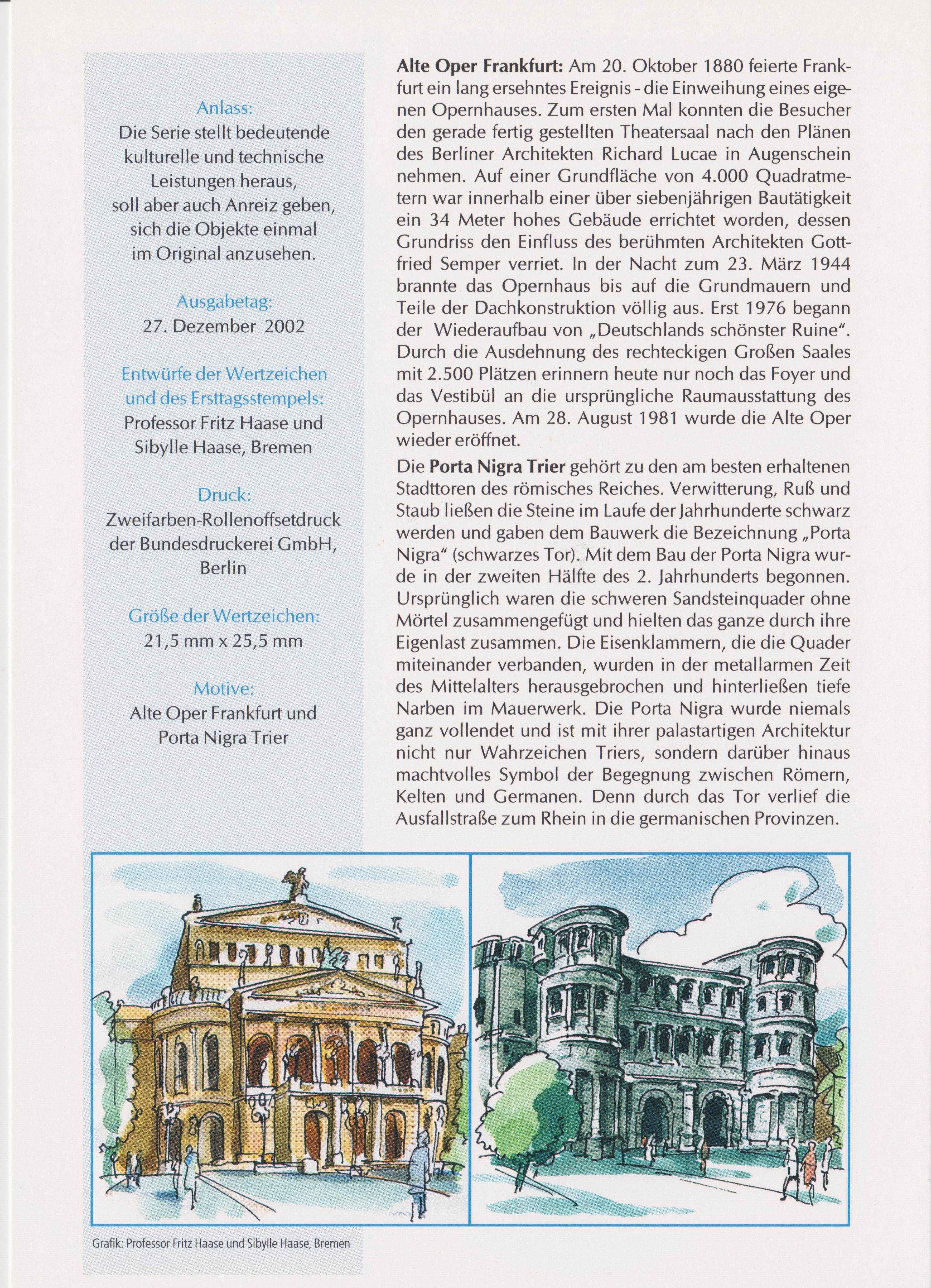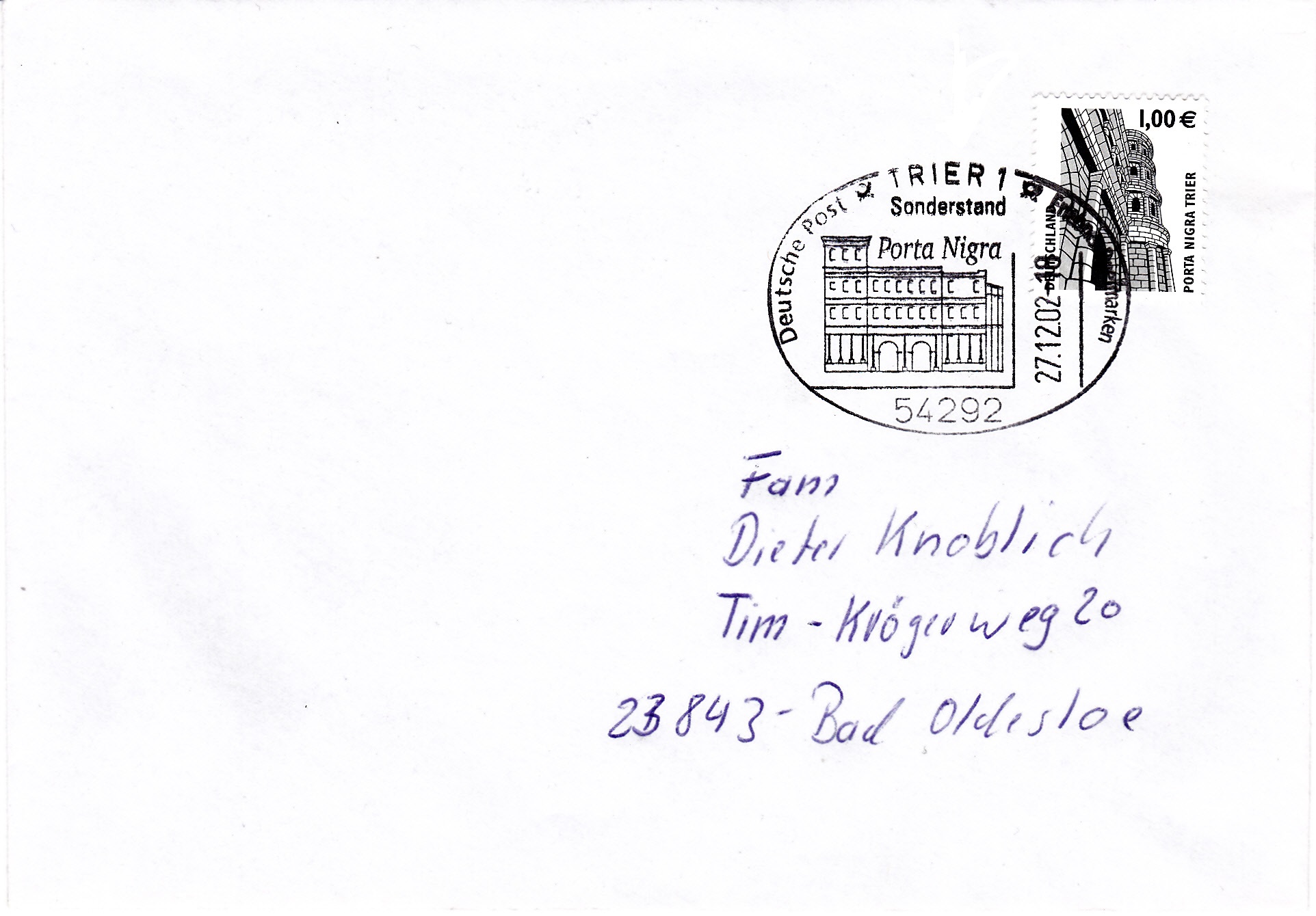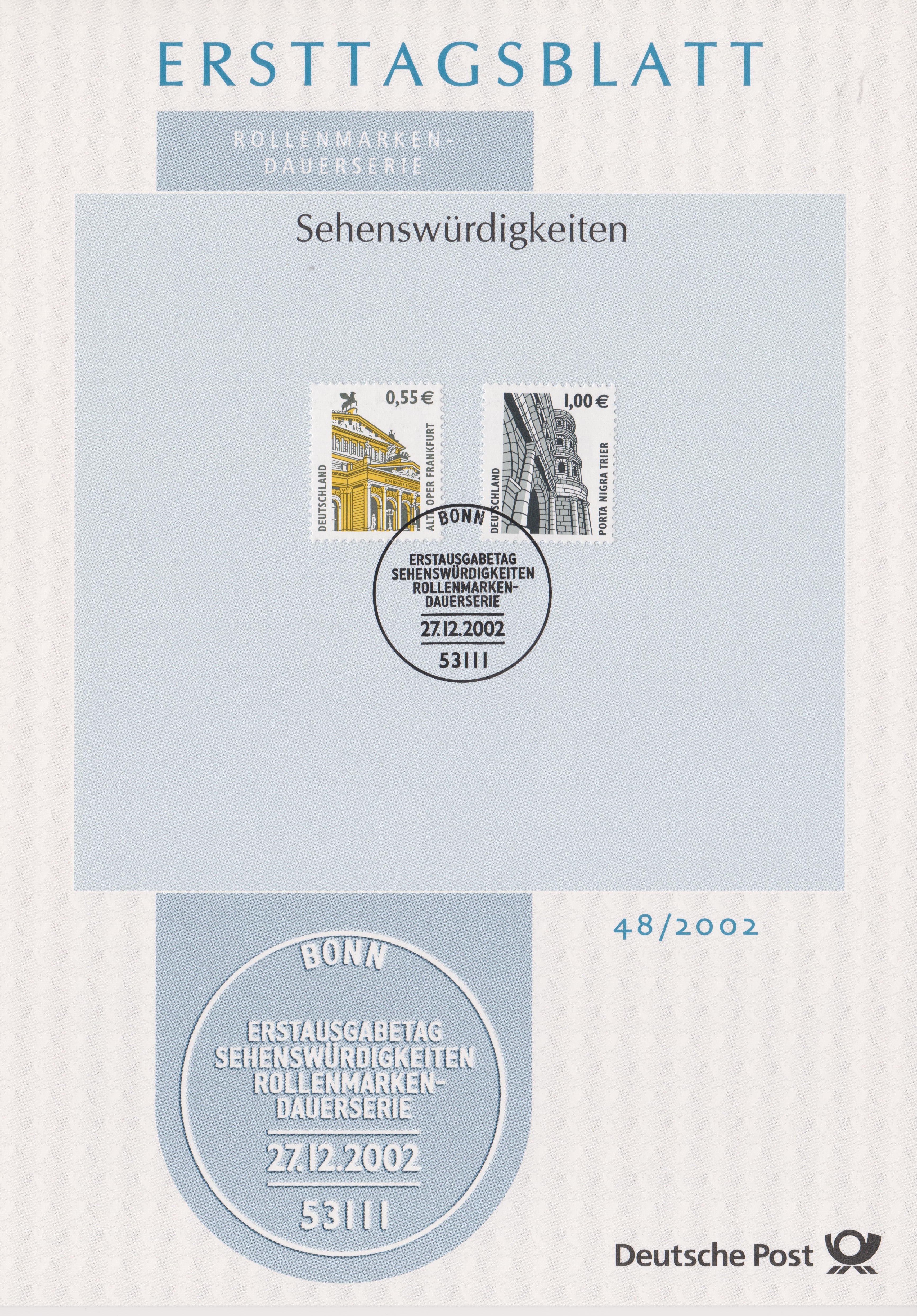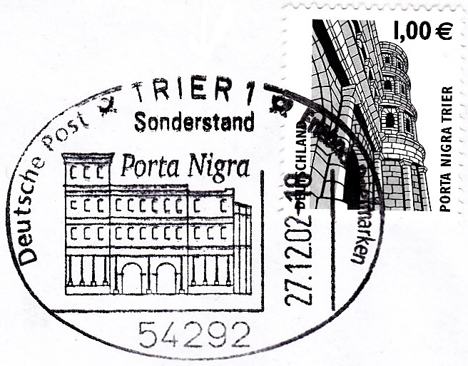 am 21.12.2002 wurde die Marke zu 1,00 € verausgabt, sie zeigt als Motiv die Porta Nigra Trier. Hier einmal als waagerechtes Paar mit Versandstellenstempel: