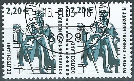 am 16.1.2003 wurde die Marke zu 2,20 € verausgabt, sie zeigt als Motiv das Fontane-Denkmal Neuruppin. Hier einmal als waagerechtes Paar mit Versandstellenstempel: