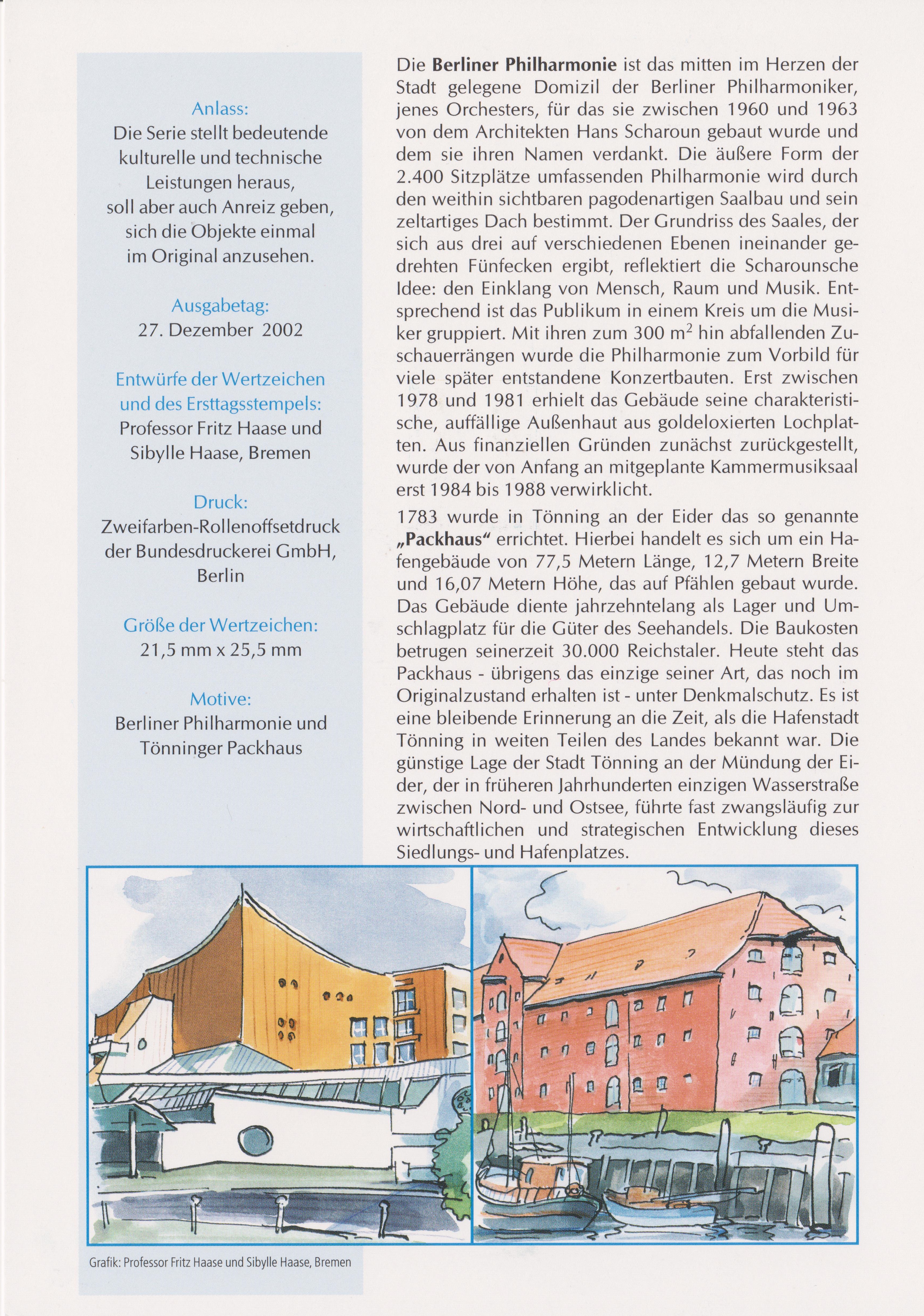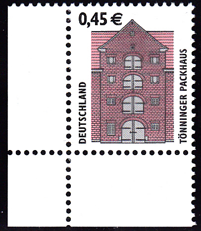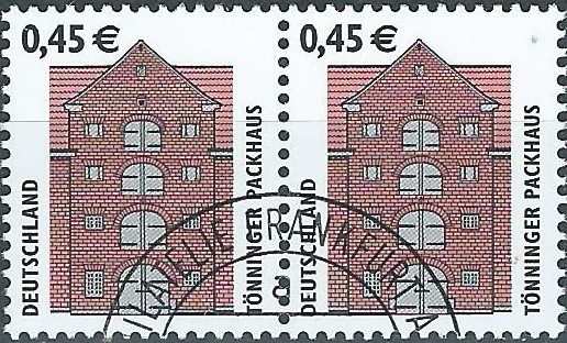 am 21.12.2002 wurde die Marke zu 0,45 € verausgabt, sie zeigt als Motiv das Tönninger Packhaus. Hier einmal als waagerechtes Paar mit Versandstellenstempel: