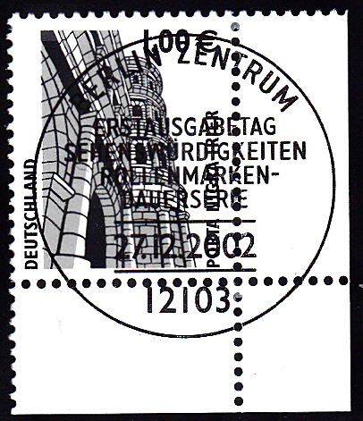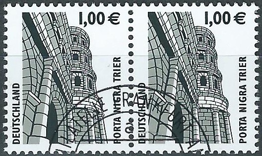 am 21.12.2002 wurde die Marke zu 1,00 € verausgabt, sie zeigt als Motiv die Porta Nigra Trier. Hier einmal als waagerechtes Paar mit Versandstellenstempel: