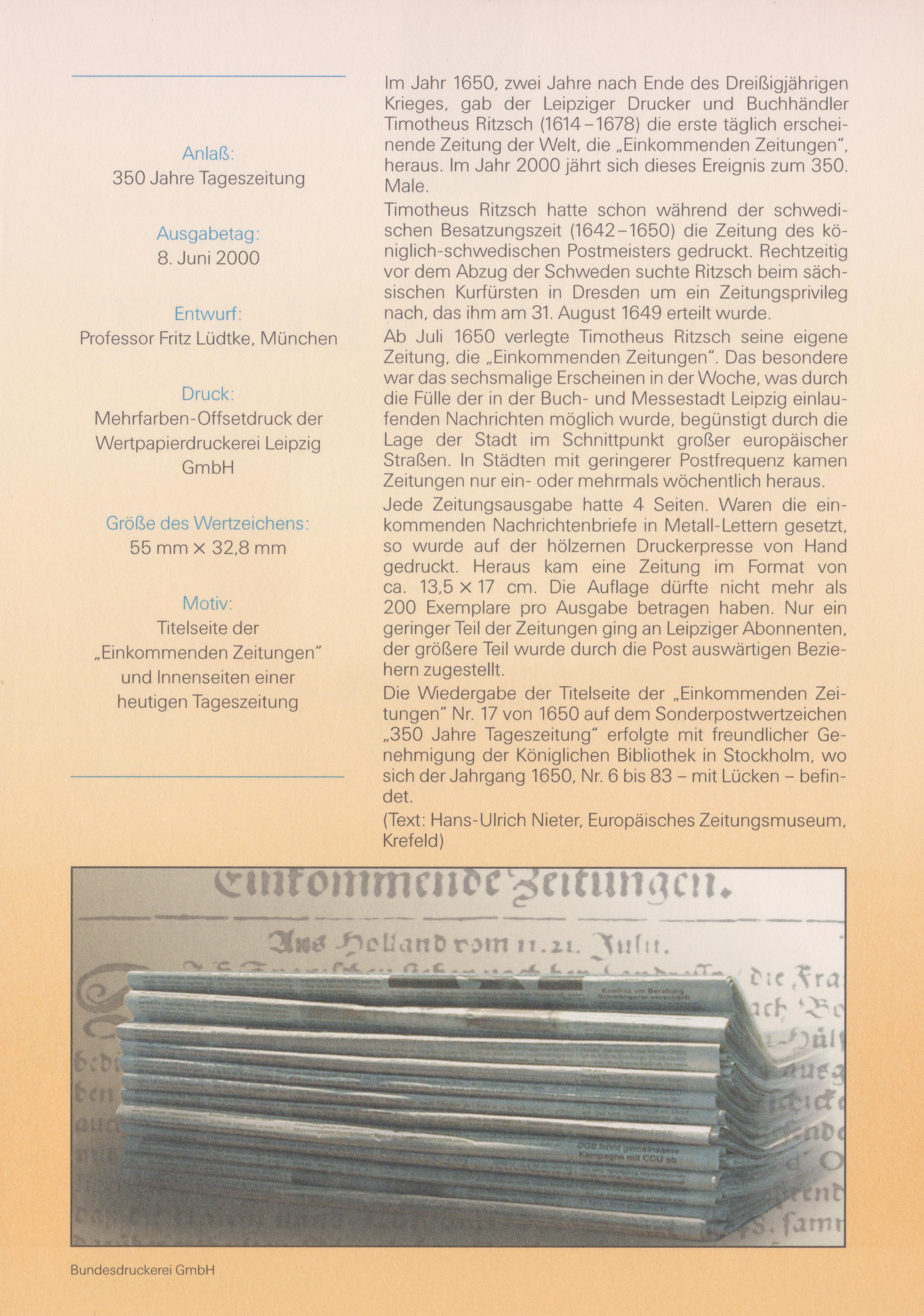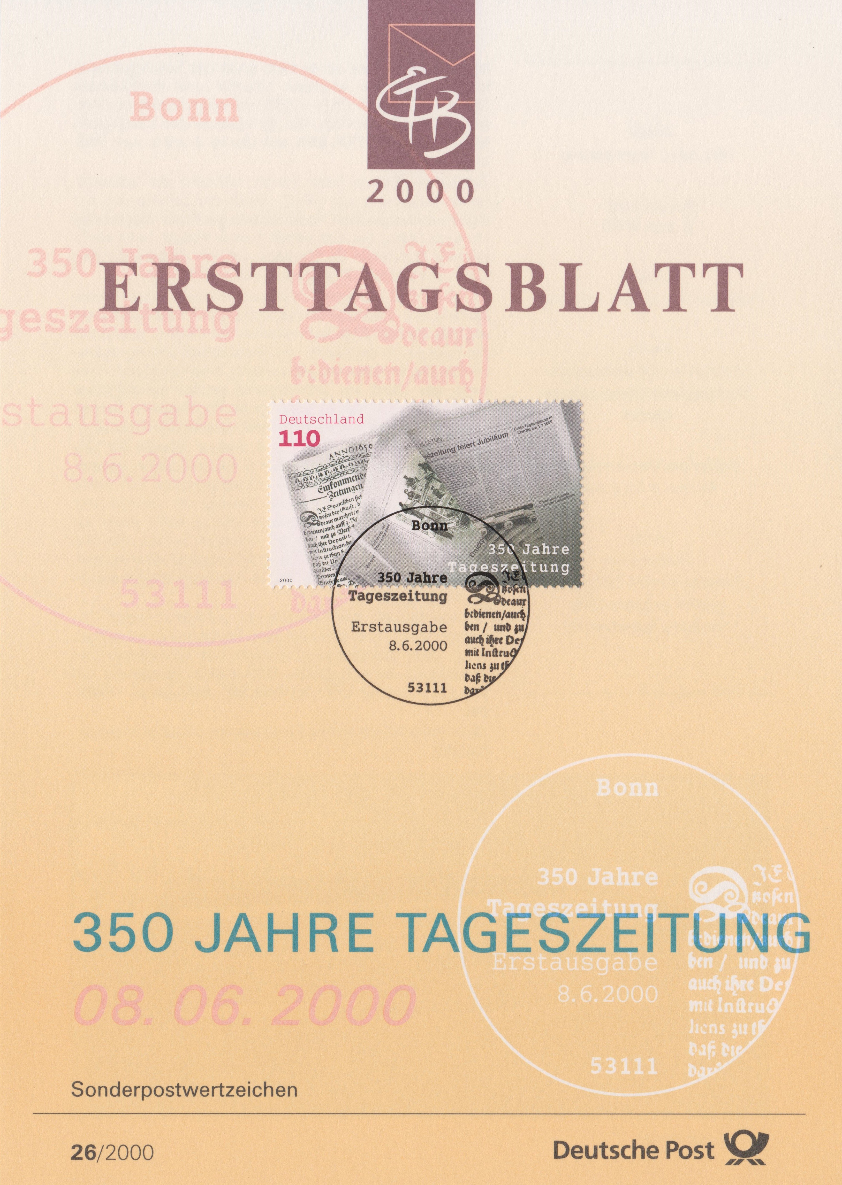 ETB 26/2000 mit BUND MiNr. 2123, erschienen am 08.06.2000 aus Anlass "350 Jahre Tageszeitung" in einer Auflage von 195 000 Stück: