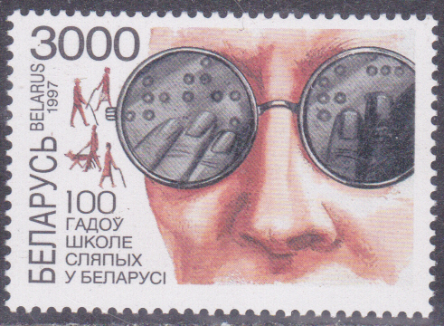 Zum Jubiläum "100 Jahre Blindenschulen in Weißrussland" ist in Weißrussland diese Marke (MiNr 239) mit dem Gesicht eines Blinden erschienen. Die Blindenschrift spiegelt sich in seiner Brille.