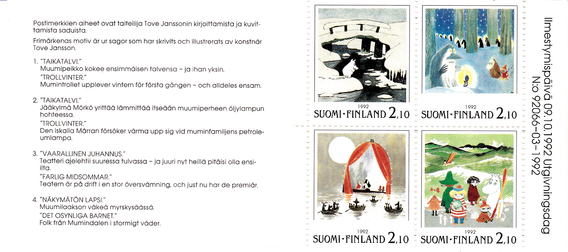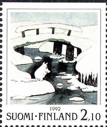 Zur Internationalen Briefmarkenausstellung NORDIA ’93 in Helsinki erschienen in Finnland Marken mit Abbildungen zu "Die Mumins". Auf dieser Marke (MiNr 1189) sehen wir eine Zeichnungen aus dem Buch "Winter im Mumintal".