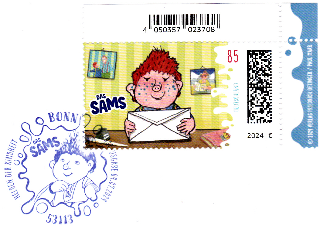 In der Serie "Helden der Kindheit" ist diese Marke (MiNr 3838) mit der Abbildung "Das Sams beim Briefeschreiben mit Bildern von Herrn Taschenbier" erschienen.
