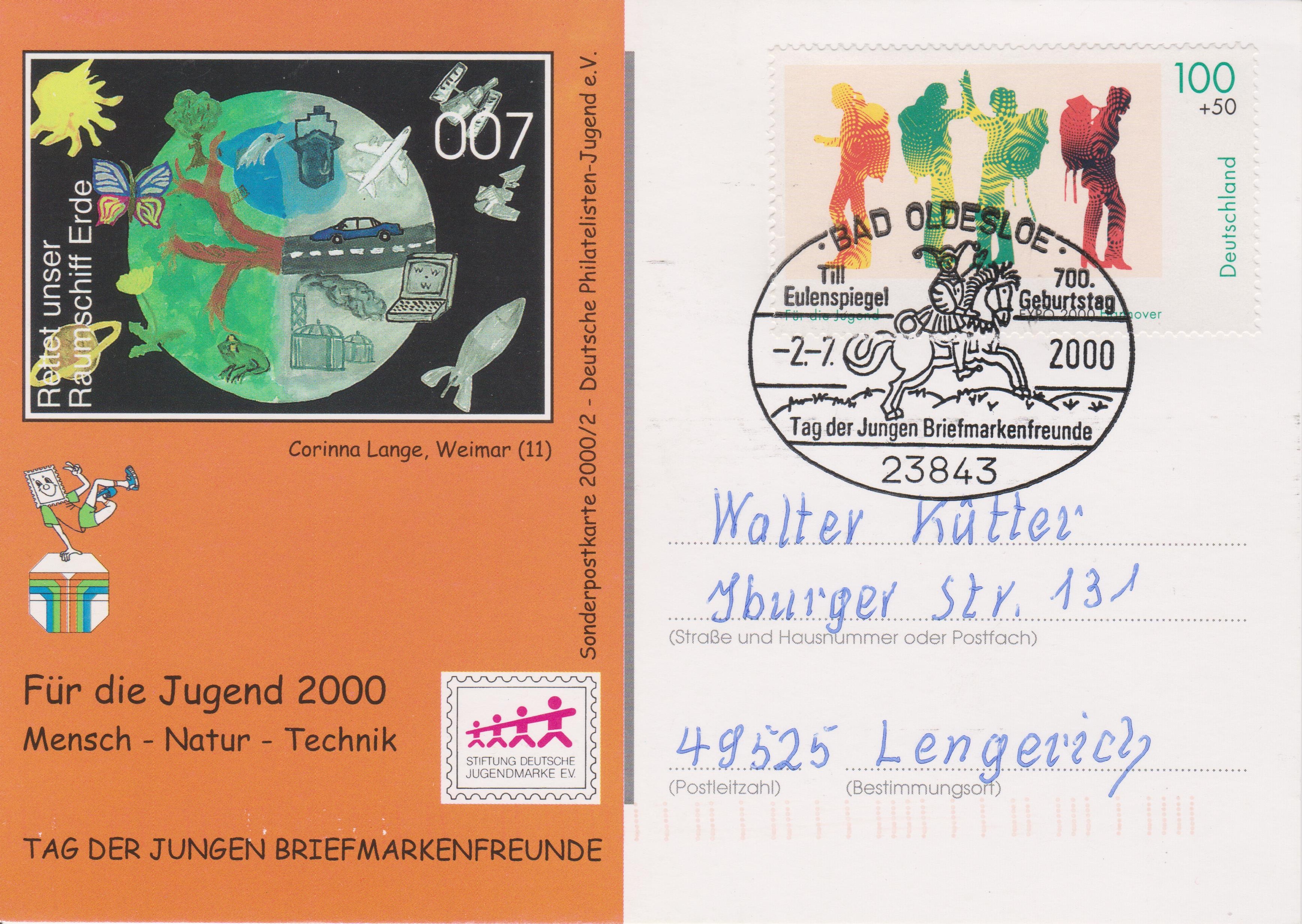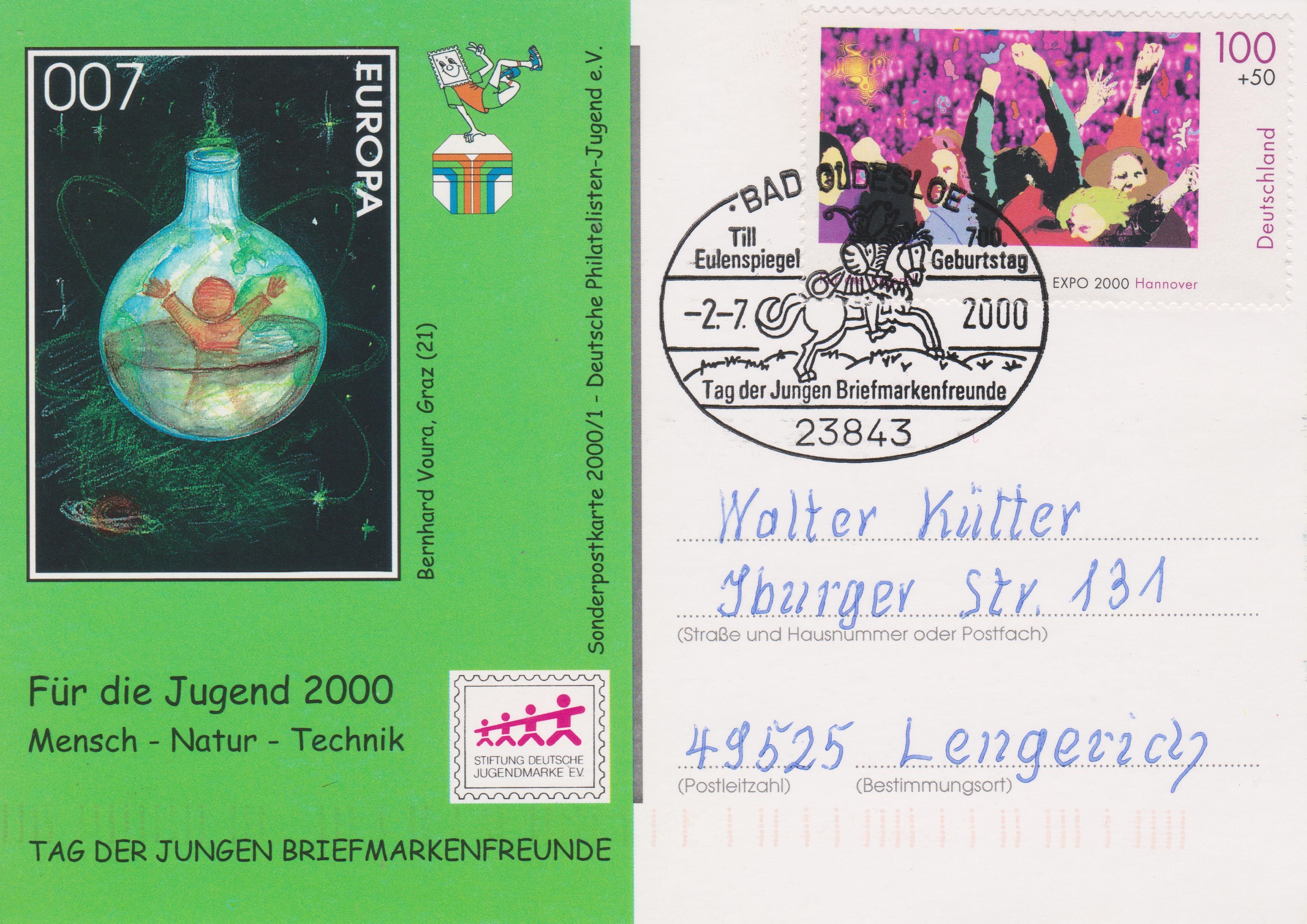 Postkarten, Portostufe 100 Pf, frankiert mit einem Postwertzeichen "Für die Jugend EXPO 2000 Hannover" zum "Tag der Jungen Briefmarkenfreunde 2000" sowie Sonderstempel aus BAD OLDESLOE "700. Geburtstag Till Eulenspiegel", echt gelaufen und entsprechend codiert: