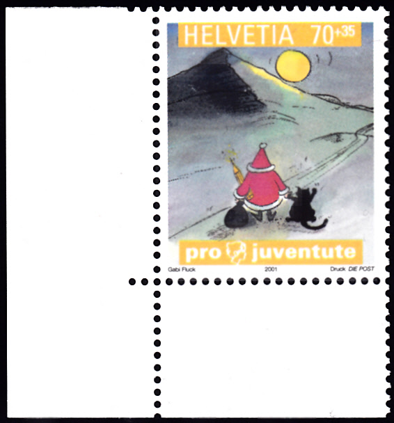 Diese Marken aus der Serie "Pro Juventute" 2001 aus der Schweiz (MiNr 1772) bildet eine Illustration von Gabi Fluck aus dem Kinderbuch "Was macht der Weihnachtsmann?" ab.