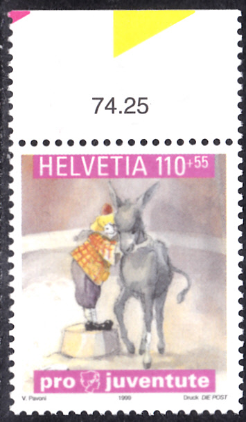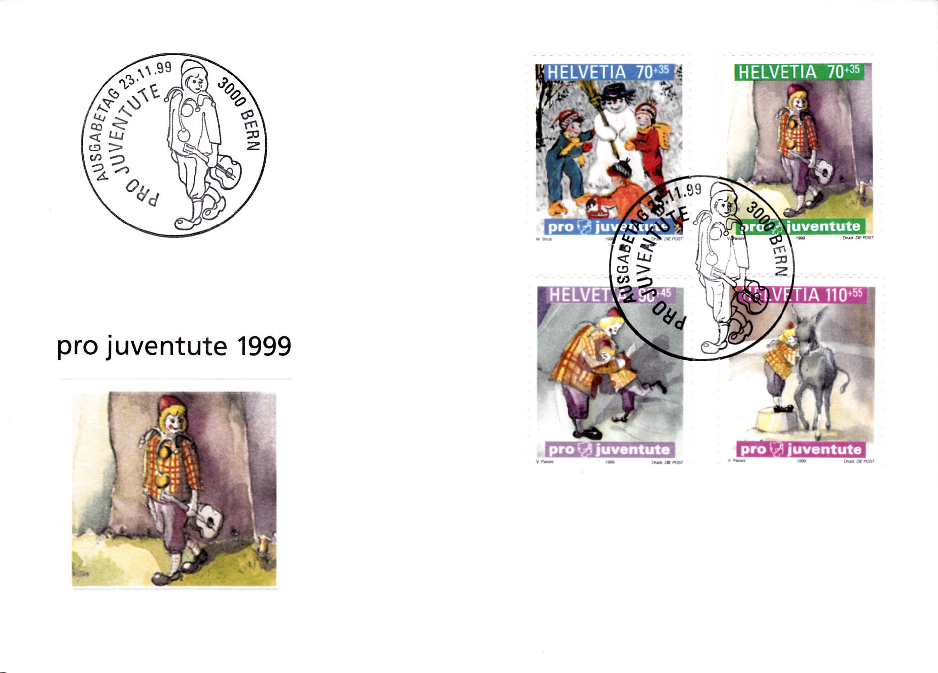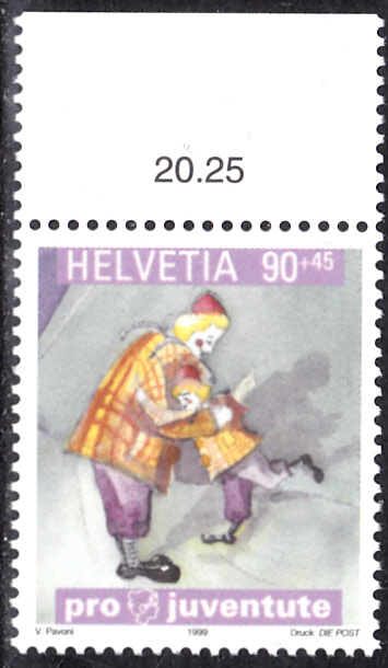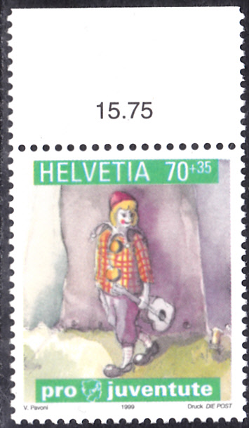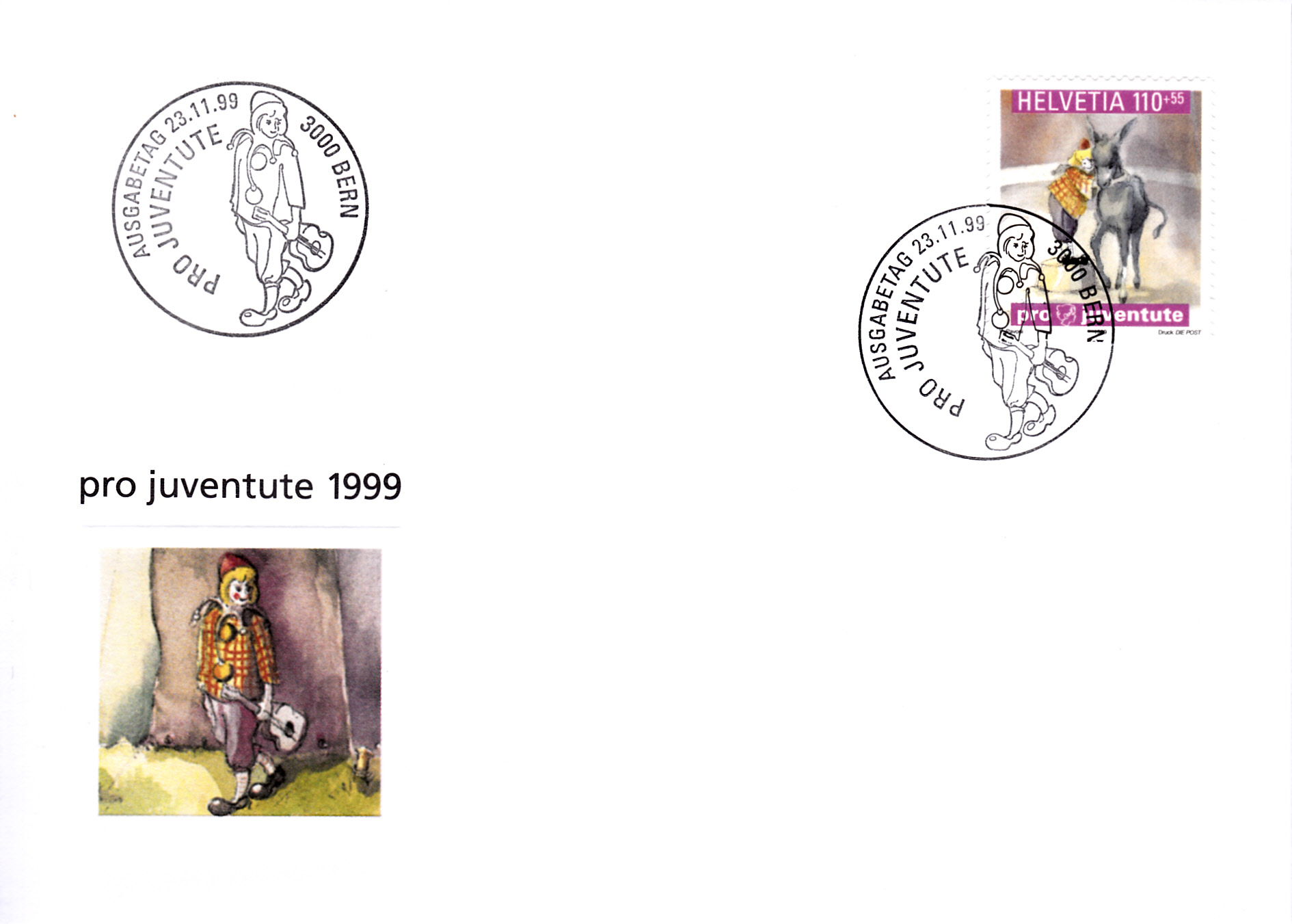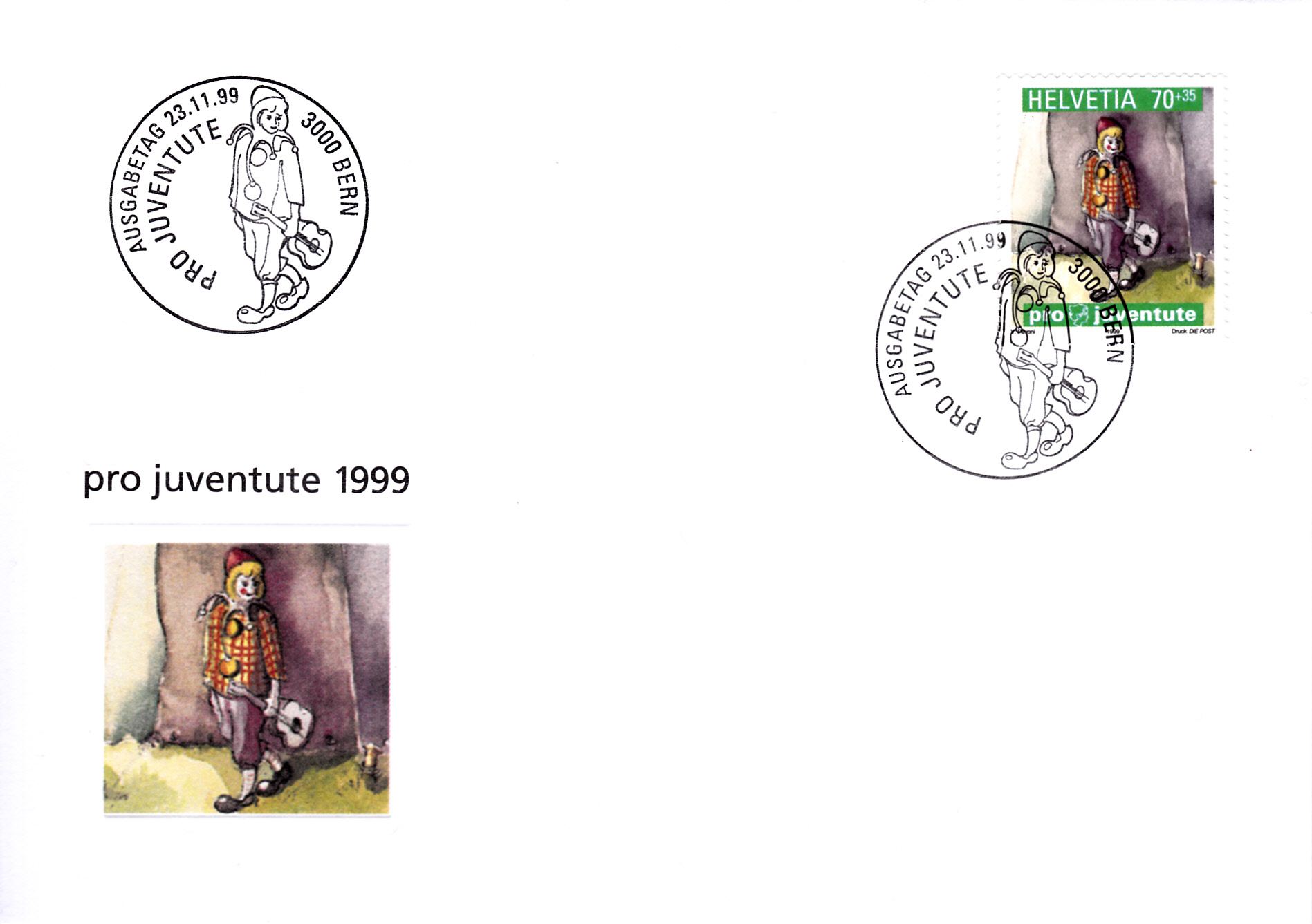 Auf dieser Marke aus der Serie "Pro Juventute 1999" (MiNr 1702) sehen wir die Illustration "Nicolo vor dem Zirkuszelt".