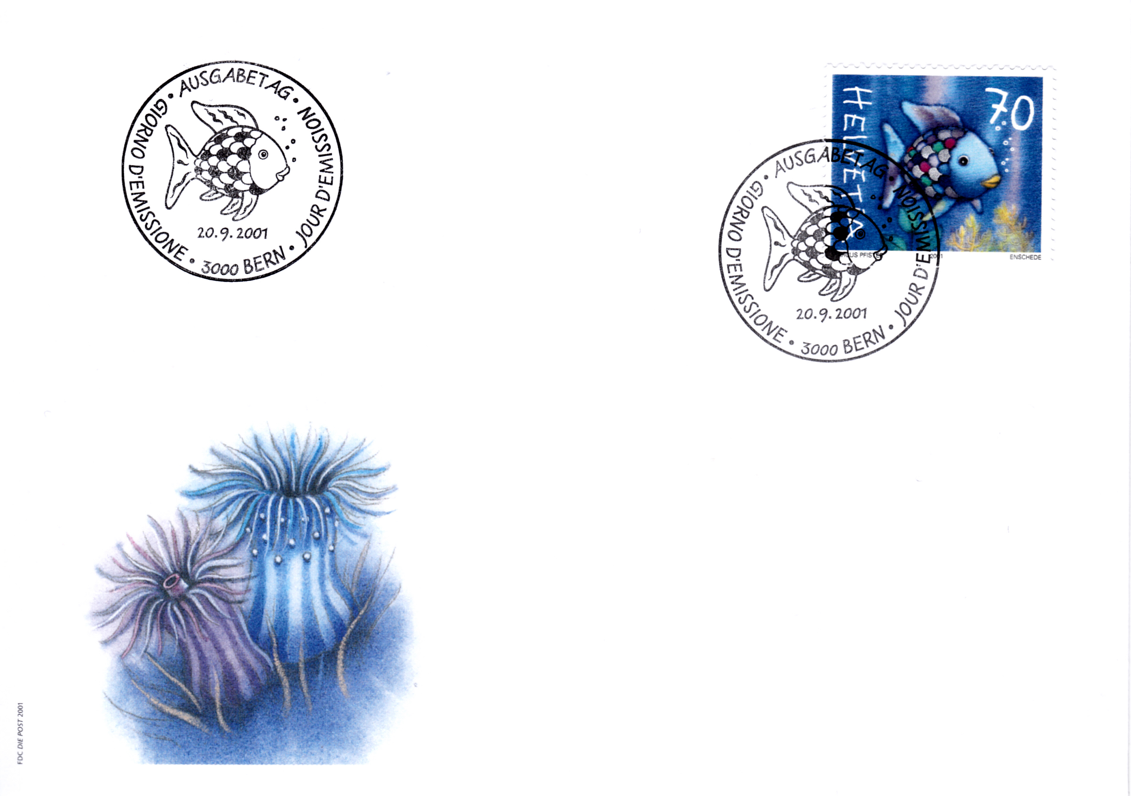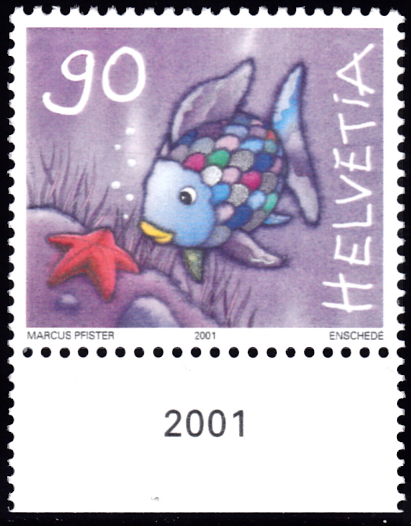 Aus der Schweiz kommt diese Marke (MiNr 1767) mit einer Illustration aus dem Kinderbuch "Der Regenbogenfisch".