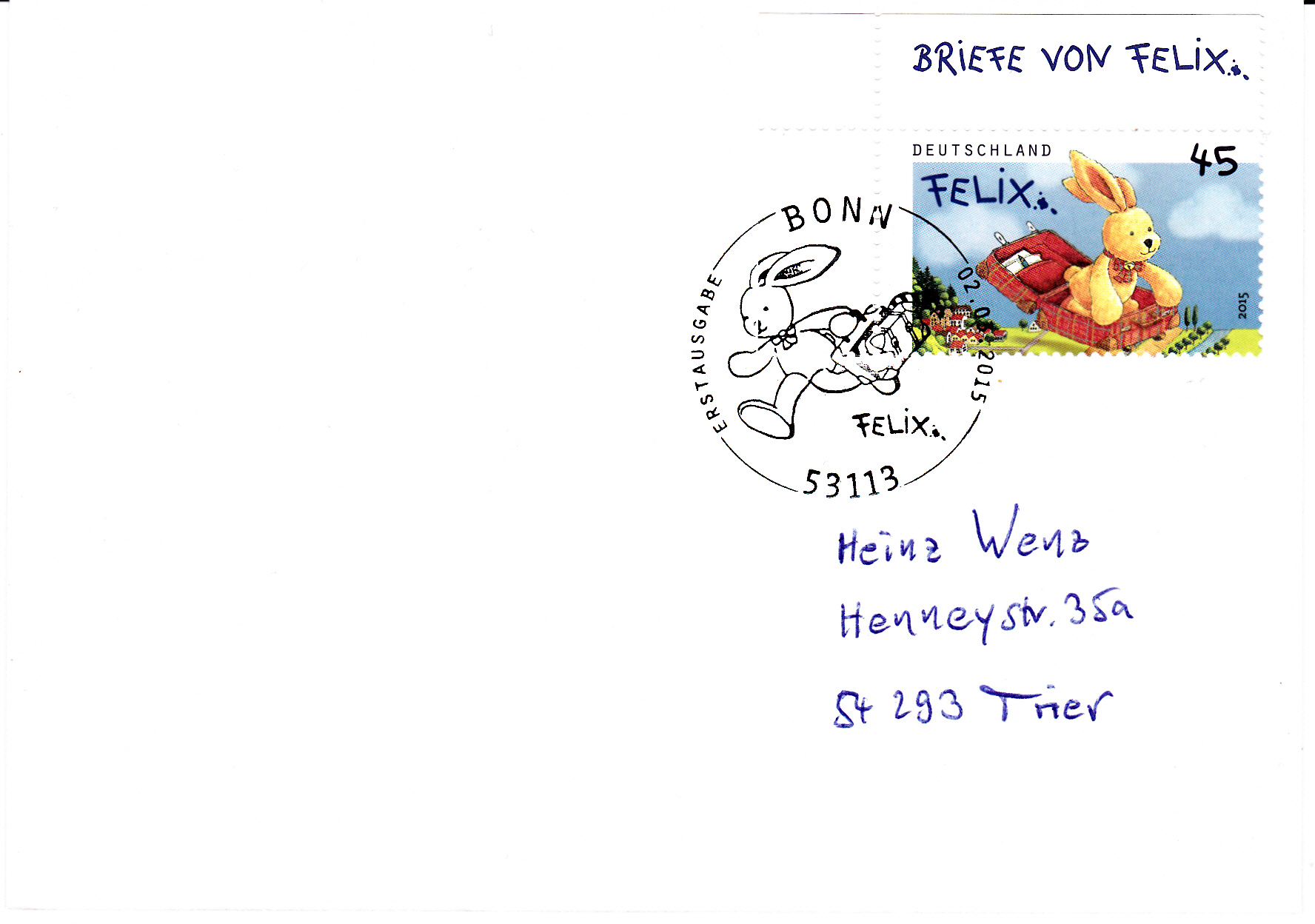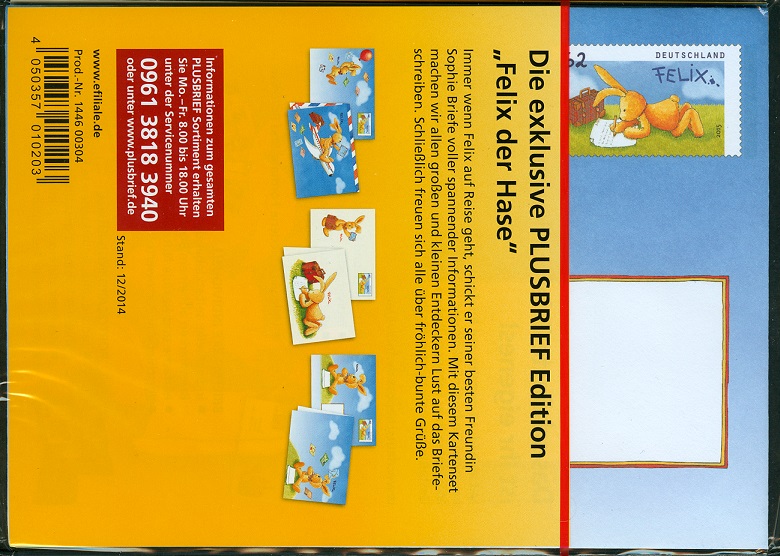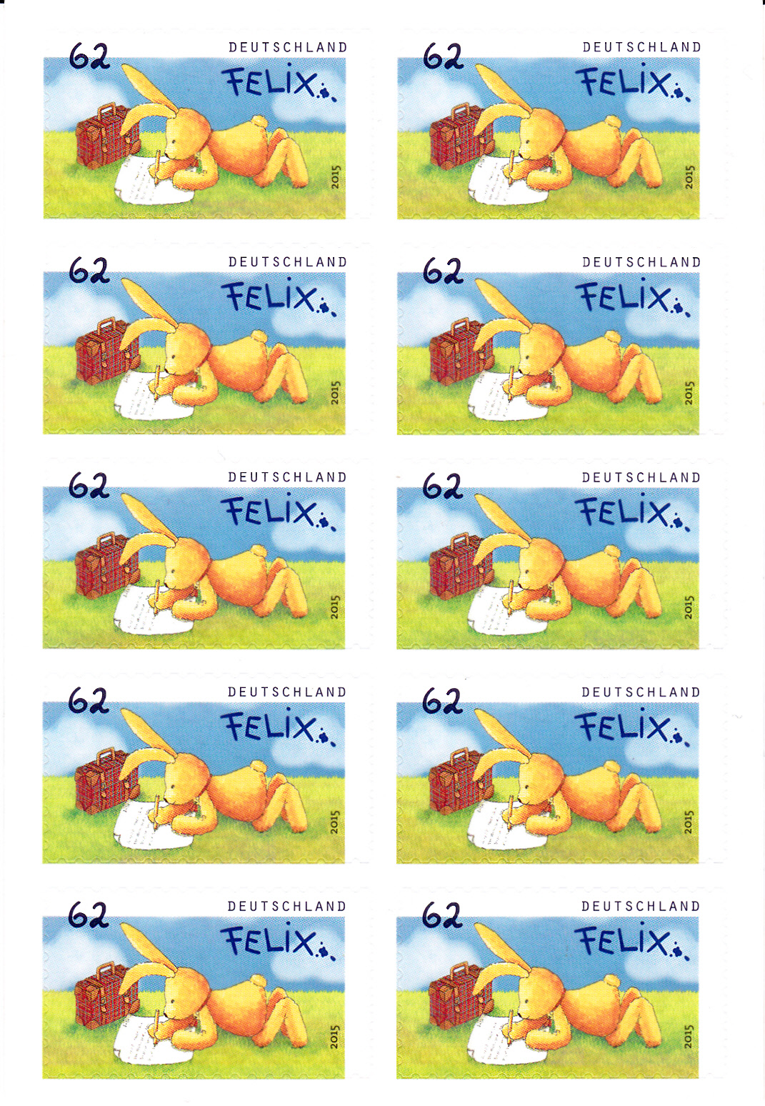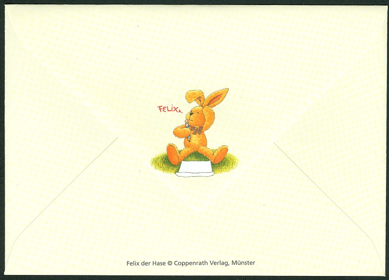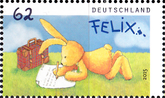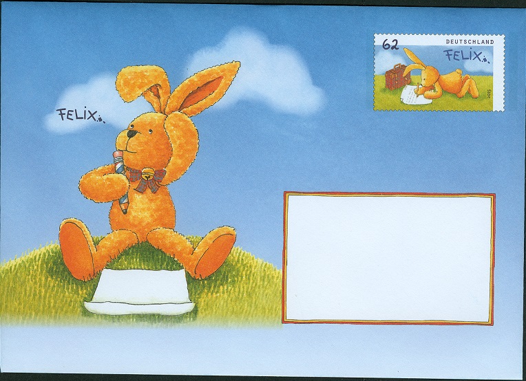 2014 hatte die Kinderbuchfigur "Felix der Hase" 20. Geburtstag. Grund genug ihm 2015 unter anderem mit 3 Ganzsachen-Briefumschlägen nachträglich einen "philatelistischen Blumenstrauss" zu überreichen.