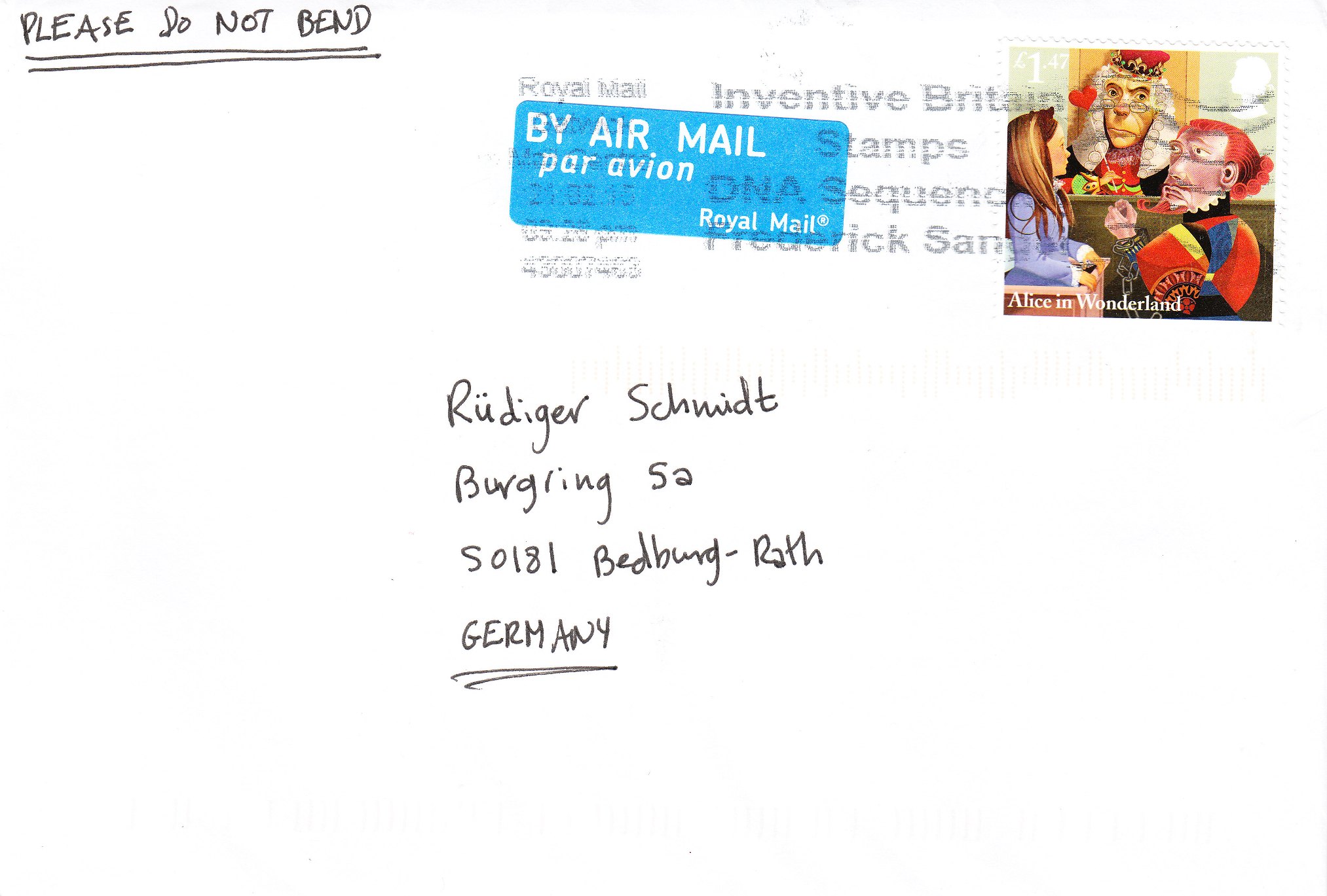 Hier eine zum Thema passende englische Briefmarke als EF auf einem nach Deutschland gelaufenen Brief: