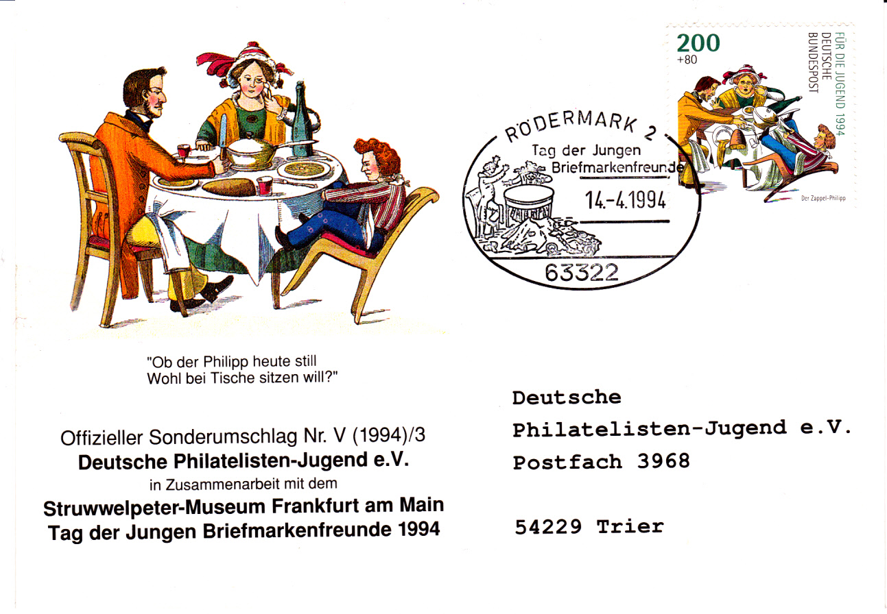 3. Bild im Sonderstempel aus Rödermark zum Tag der Jungen Briefmarkenfreunde am Ersttag der Markenserie.