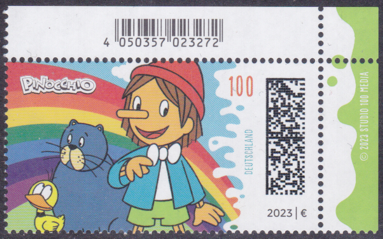 Bei der Deutschen Post ist eine Marke (MiNr 3804) in der Serie "Helden der Kindheit" erschienen. Sie zeigt die Holzpuppe Pinocchio mit der Ente Gina und der Katze Giulietta vor einem Regenbogen. Ich stelle hier eine Marke vom Eckrand mit EAN-Codierung vor.