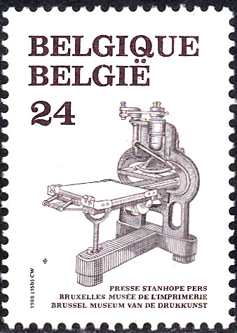 Diese Marke aus Belgien (MiNr 2362) bildet eine Stanhope-Buchdruckhandpresse aus dem 18. Jahrhundert ab.
