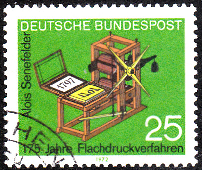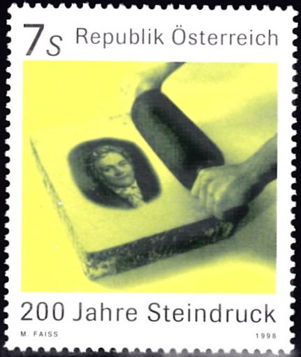 Zum Jubiläum "200 Jahre Steindruck" ist in Österreich diese Marke (MiNr 2246) erschienen. Sie zeigt Alois Senefelder, den Erfinder der Lithographie, auf einem Lithographiestein.