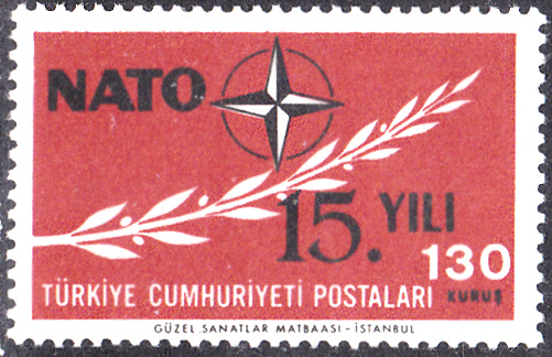 Aus der Türkei kommt diese Marke (MiNr 1899) zum Thema "15 Jahre NATO" mit dem NATO-Emblem und der Zahl "XV".