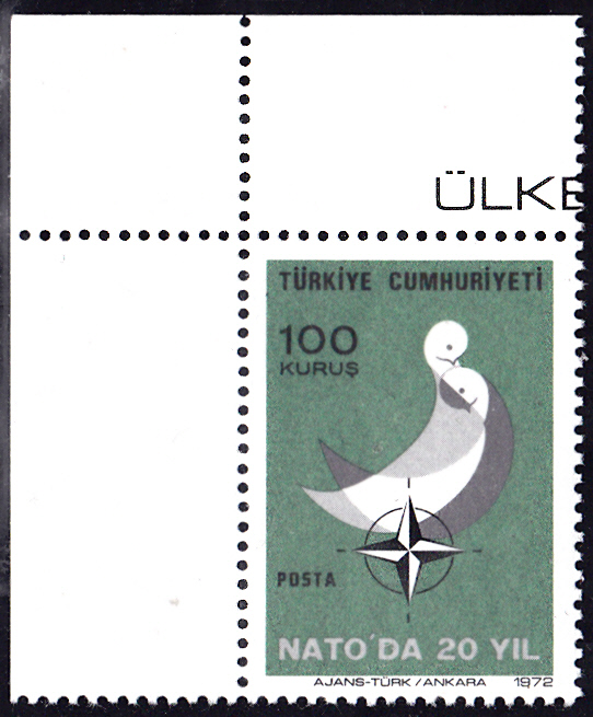 Zu "20 Jahre Mitgliedschaft in der NATO" ist in der Türkei diese Marke (MiNr 2250) mit dem NATO-Emblem und einem Symbol für Sicherheit erschienen.