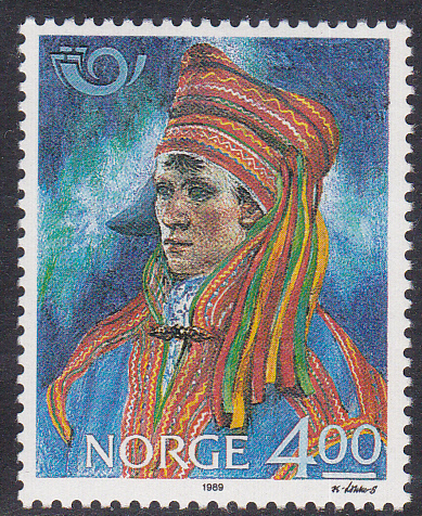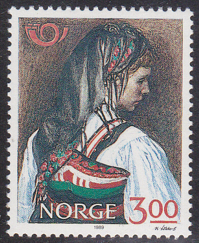 Im Jahre 1989 sind die Marke NORDEN zum Gemeinschaftsthema "Volkstrachten" erschienen. Hier eine Marke aus Norwegen (MiNr 1017) mit einer Frau mit Tracht aus dem Setesdal. Die Marke hatte eine Auflage von 10 050 360 Stück.