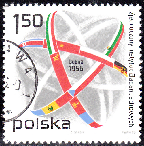 In Polen ist diese Marke (MiNr 2435) zu 20 Jahre Vereinigtes Institut für Kernforschung in Dubna erschienen. Sie zeigt ein Atommodell mit den Flaggen der beteiligten Länder.