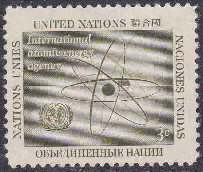 Eine an anderer Stelle bereits gezeigten Marke zu 3 Cent (MiNr 66) der UN-Postverwaltung in New York für die Internationale Atomenergie-Organisation (IAEA) zeigt im Markenbild einen Atomkern mit Elektronenbahnen. Die Inschrift im Markenbild ist in Englisch.