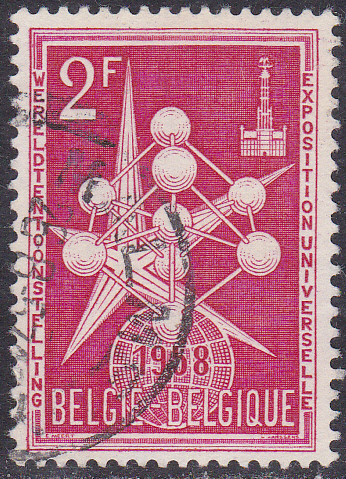 Diese Marke zu 2 Franc zur EXPO 1958 in Brüssel (MiNr 1054) zeigt das Atomium im Markenbild.