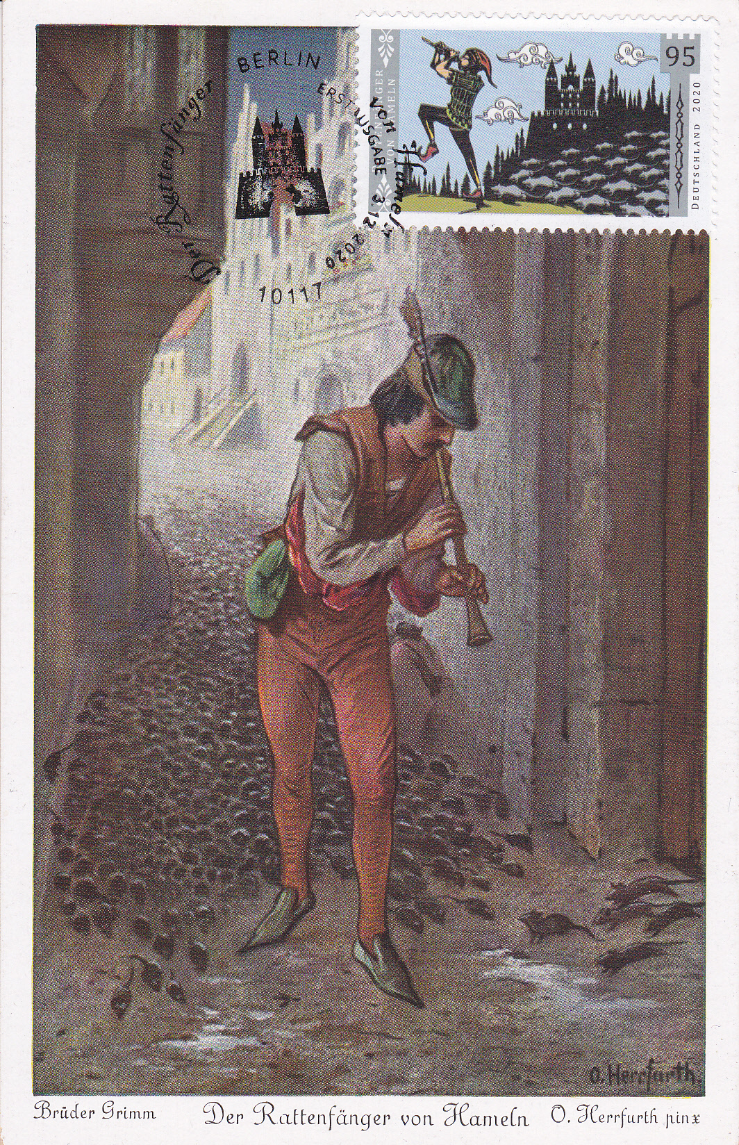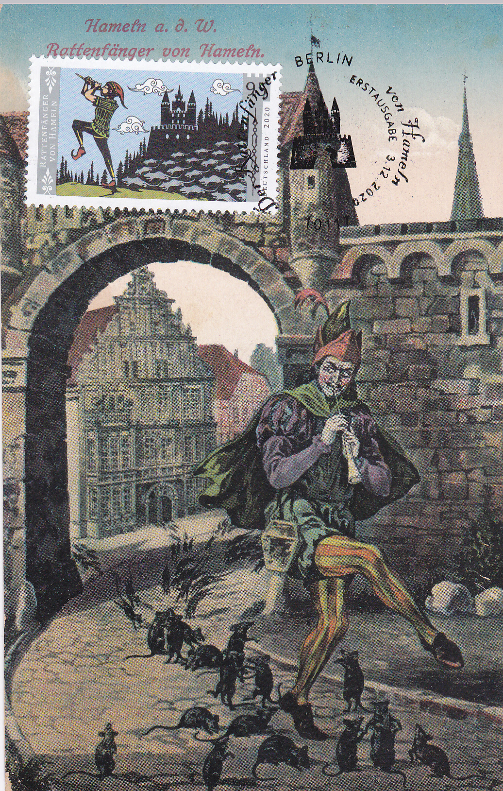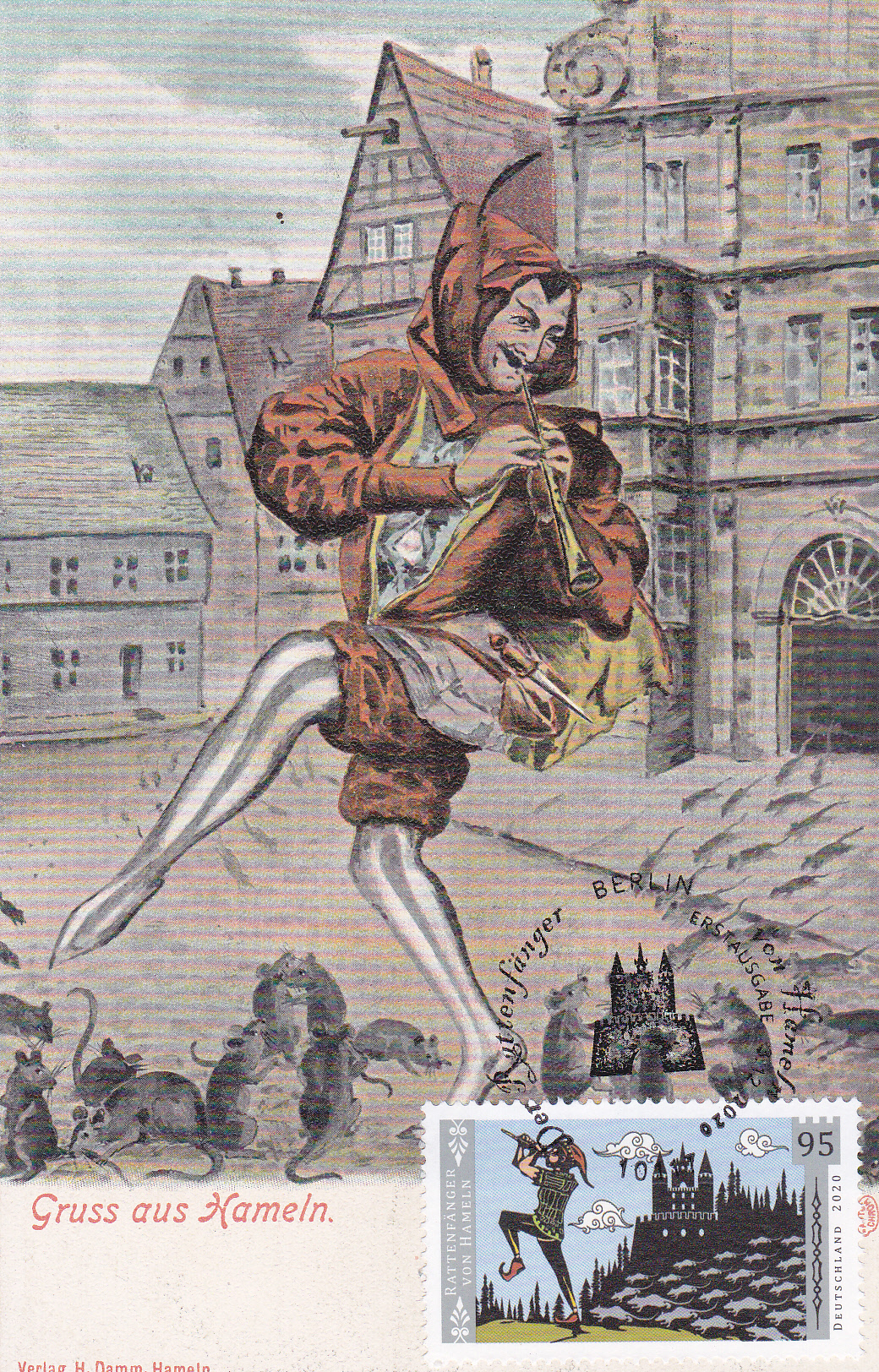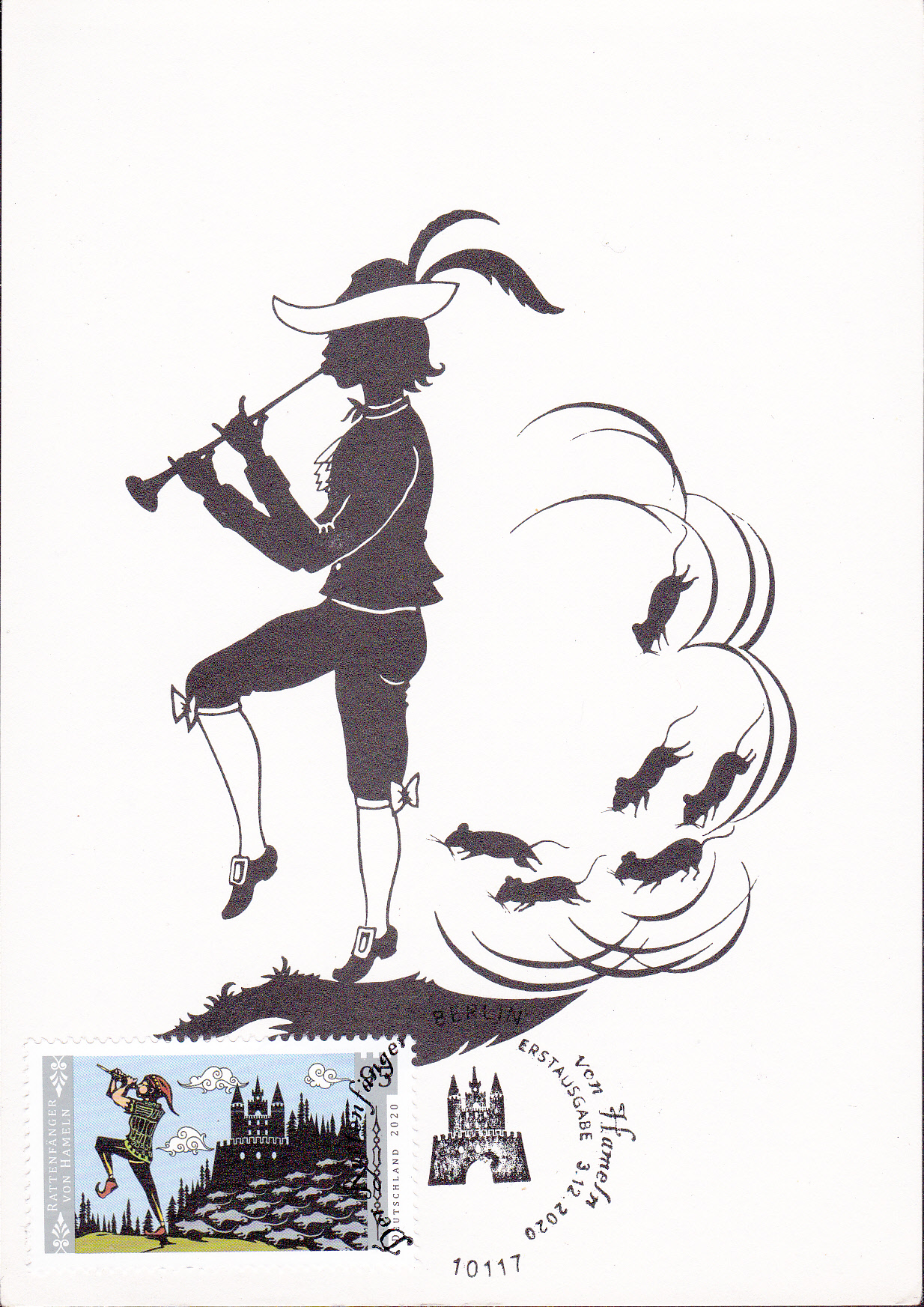 Es gibt zahlreiche ältere Postkarten mit Motiven zum Rattenfänger von Hameln. Einige wurden zur Anfertigung von Maximumkarten verwendet. Hier kann ich ein paar dieser Karten zeigen. Zur Entwertung der aufgeklebten Marke wurde der Ersttagsonderstempel aus Berlin verwendet.