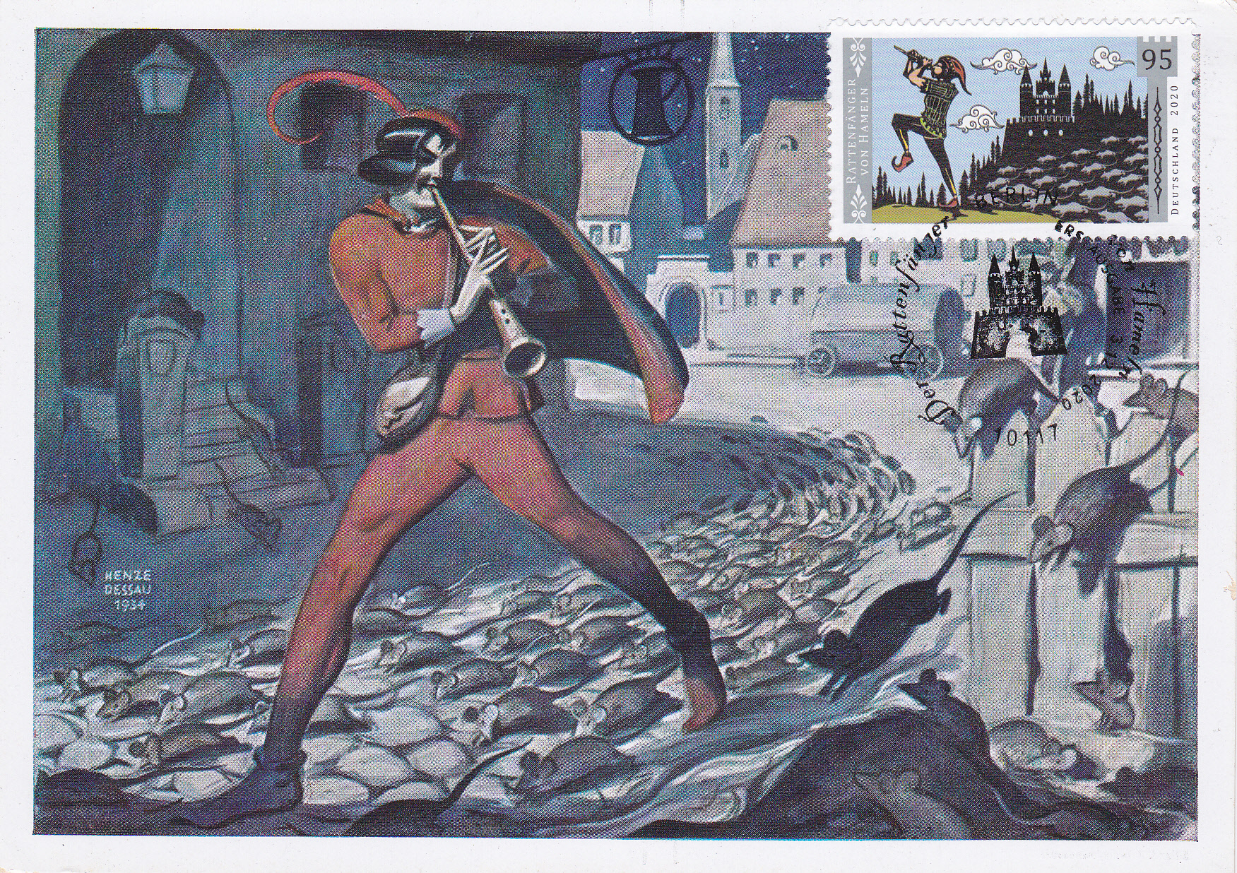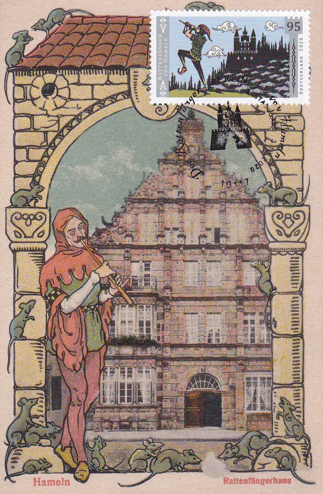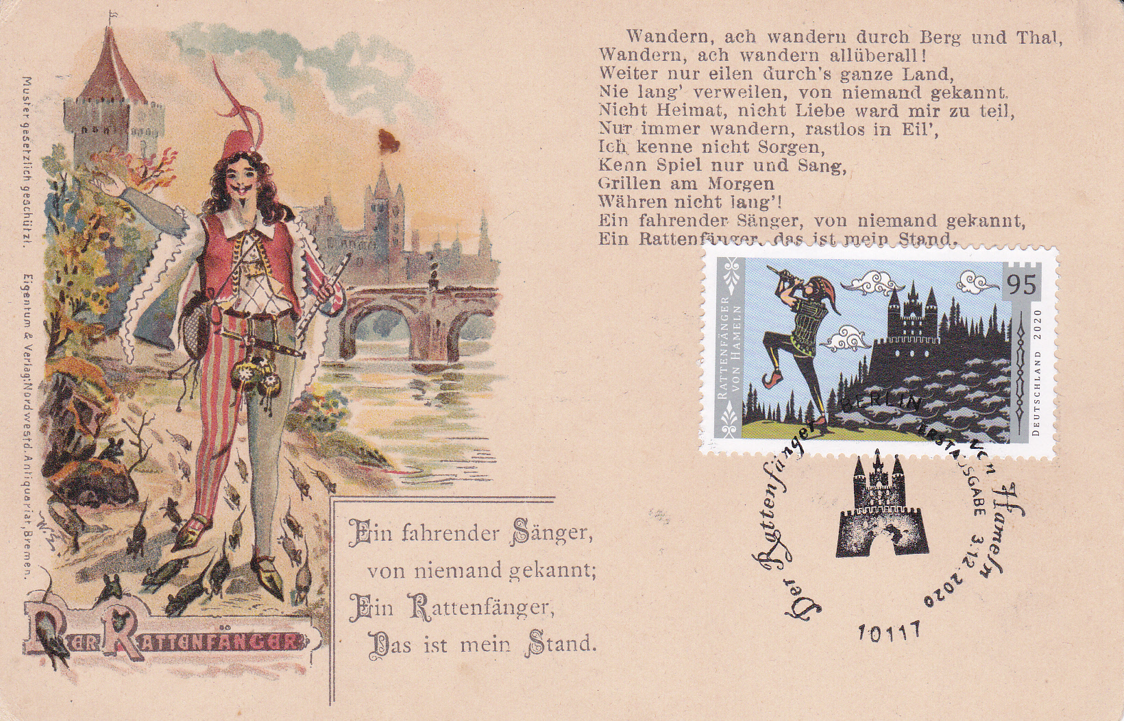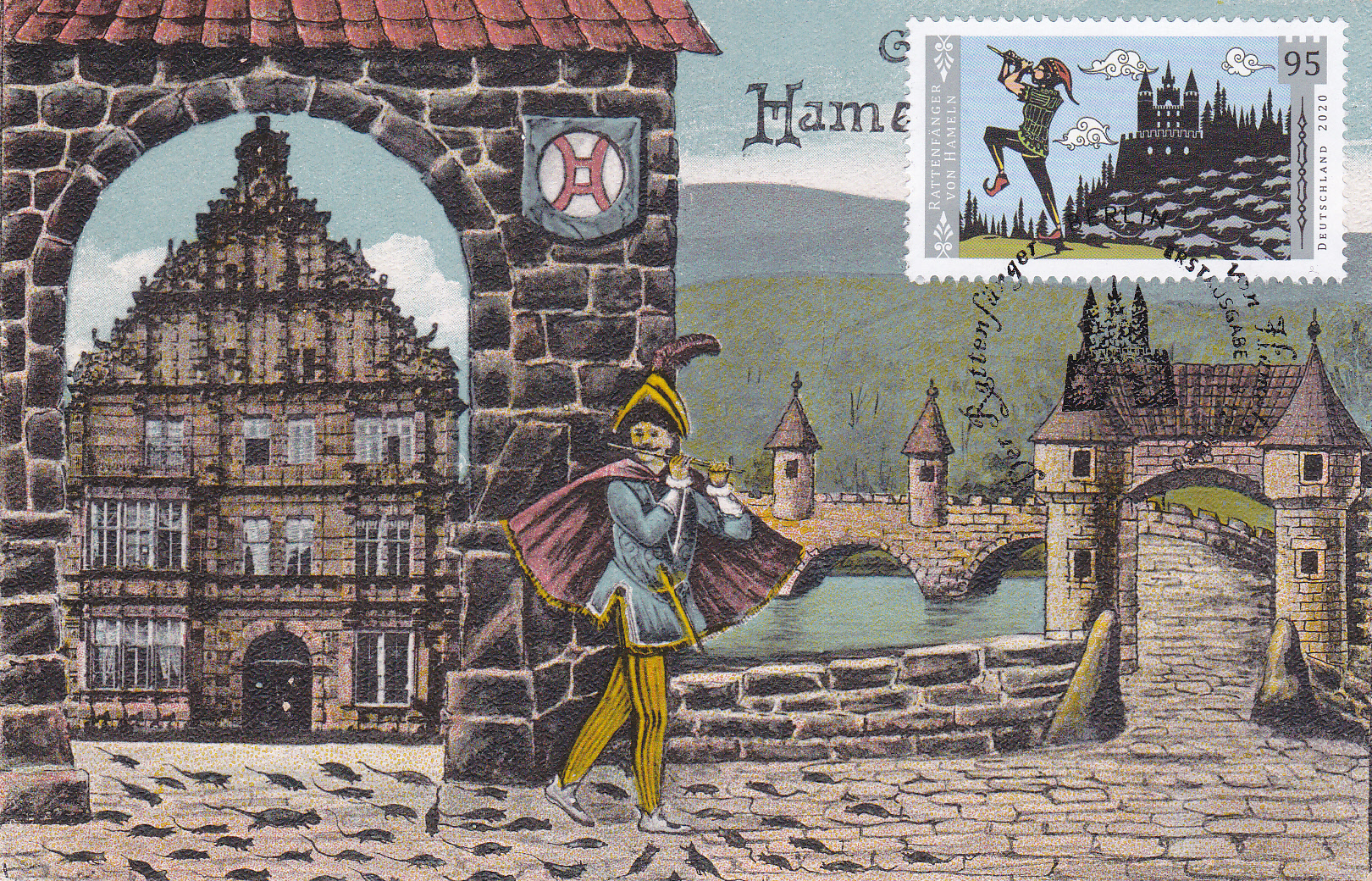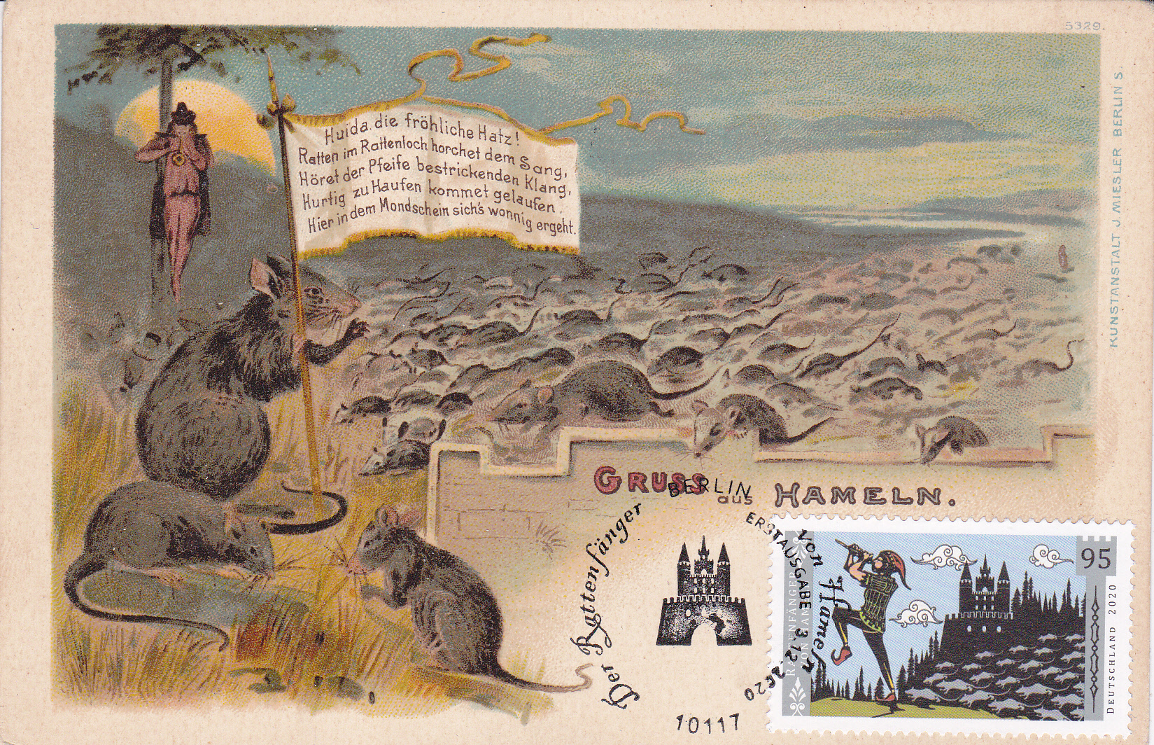 Es gibt zahlreiche ältere Postkarten mit Motiven zum Rattenfänger von Hameln. Einige wurden zur Anfertigung von Maximumkarten verwendet. Hier kann ich ein paar dieser Karten zeigen. Zur Entwertung der aufgeklebten Marke wurde der Ersttagsonderstempel aus Berlin verwendet.