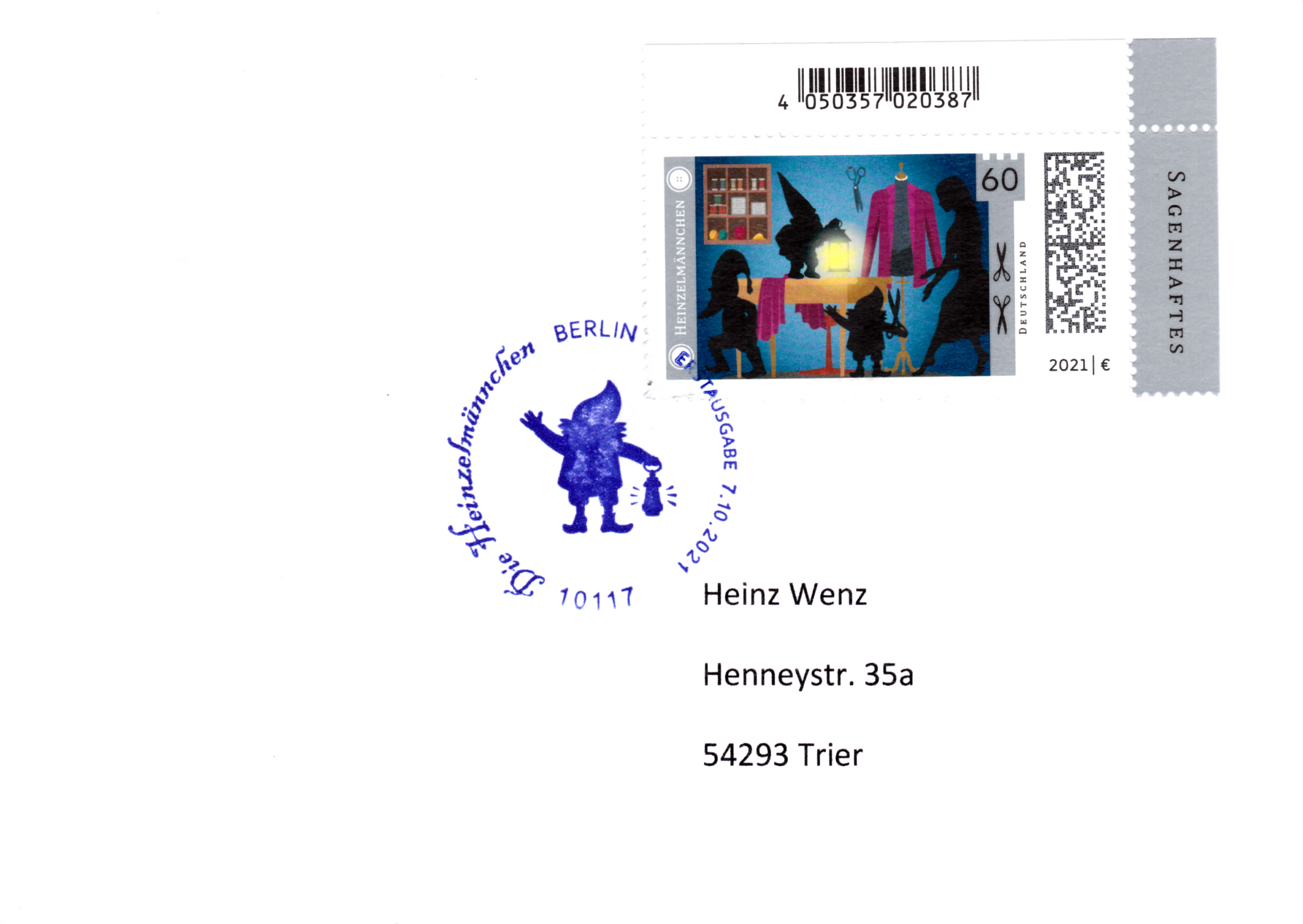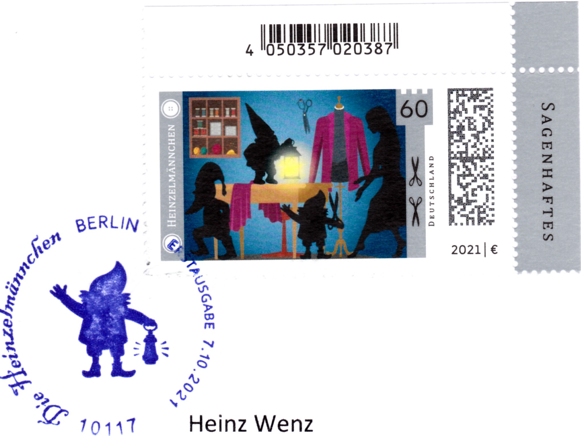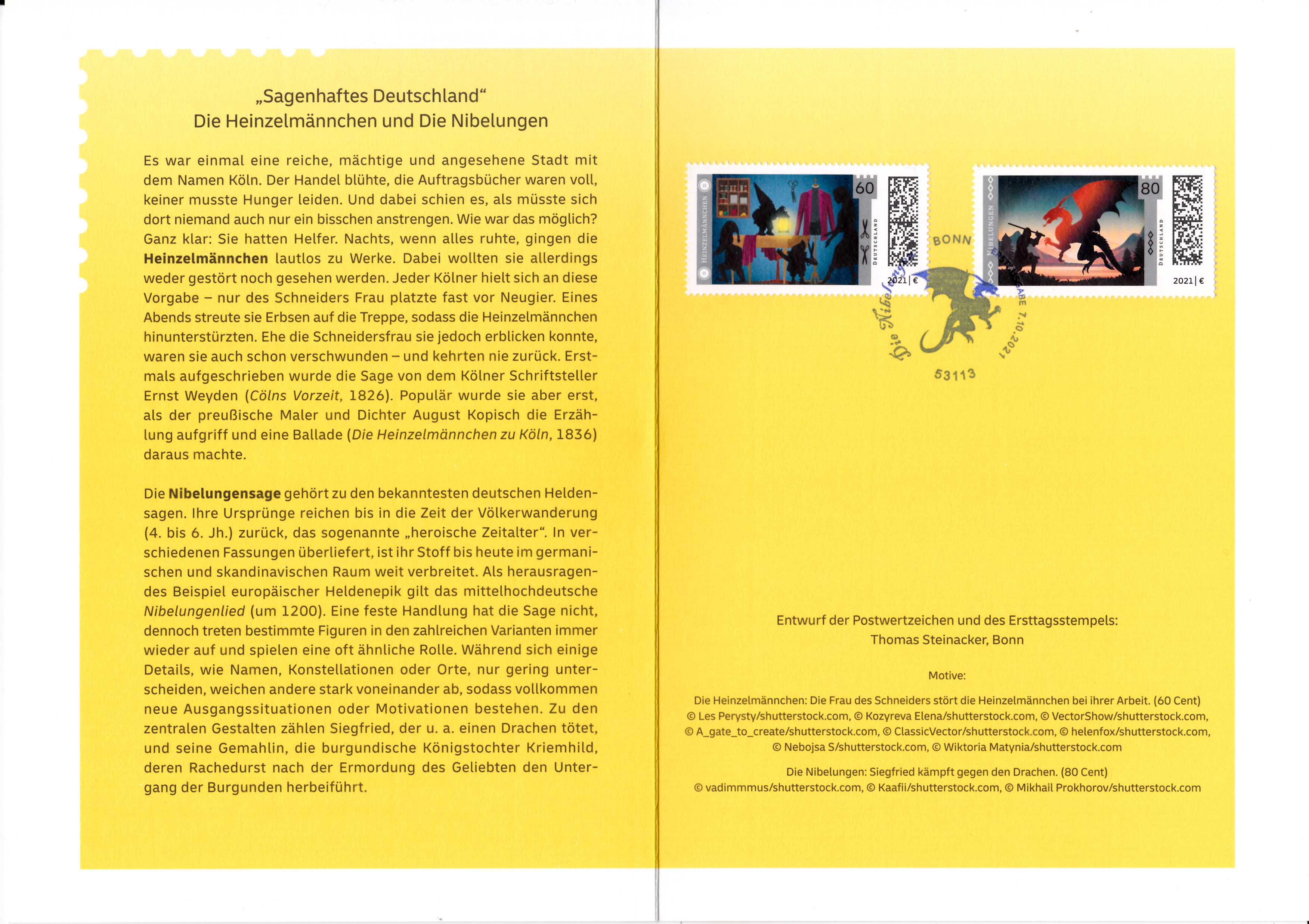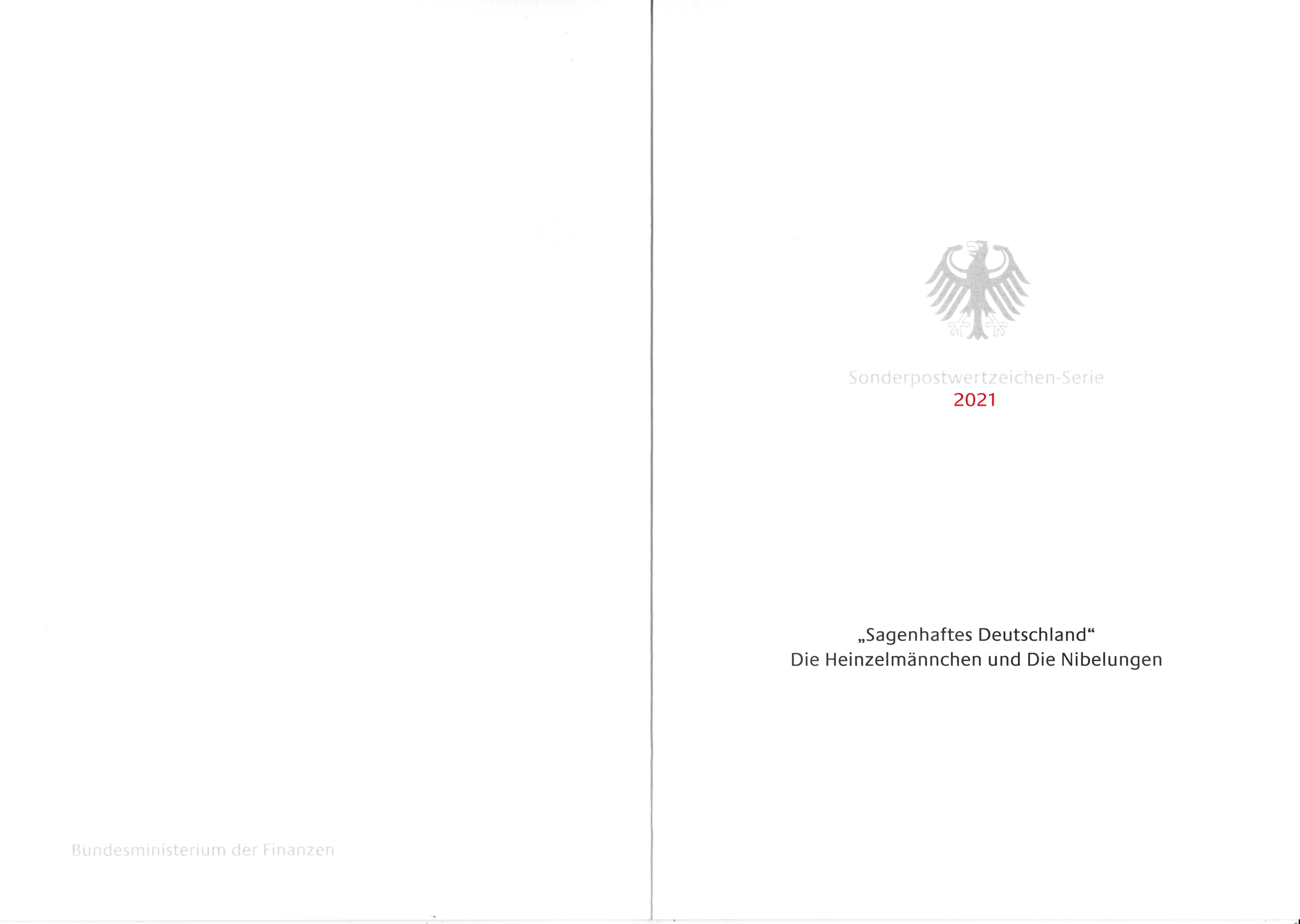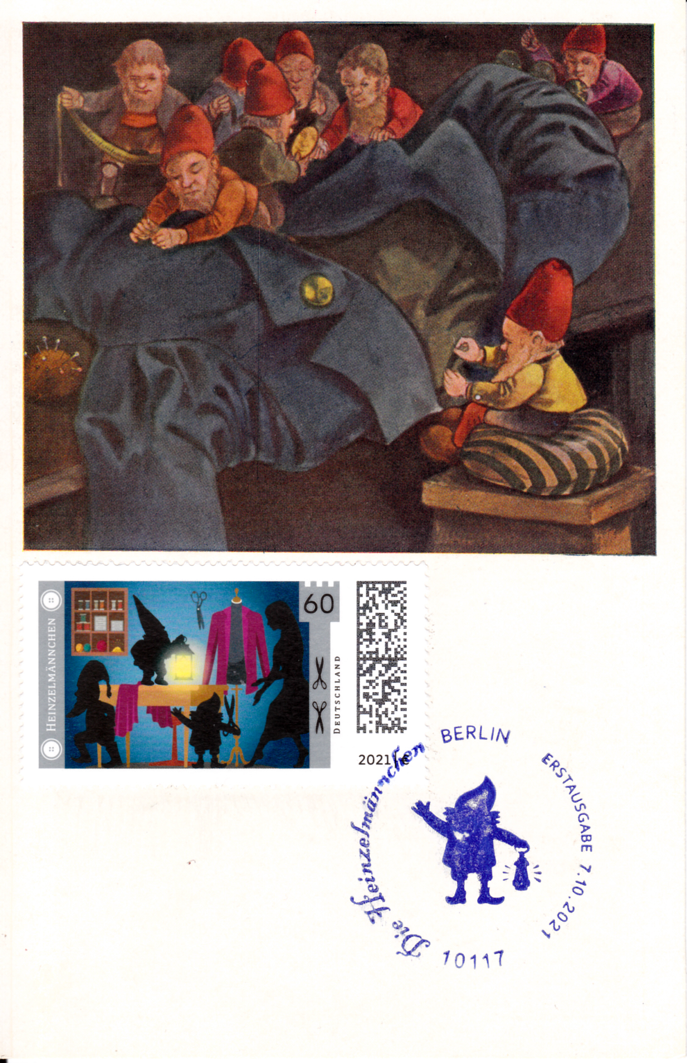 Ministerkarte des Bundesministers für Finanzen mit den beiden Marken der Deutschen Post (MiNr 3631/3632) der Serie "Sagenhaftes Deutschland" mit den Motiven "Schneidersfrau überrascht Heinzelmännchen bei der Arbeit" und "Siegfried erschlägt Fáfnir" und den beiden Ersttagsonderstempel Bonn und Berlin. Wegen der Bundestagswahl am 26.9.2021 gab es am Tag der Ausgabe der Marken im Oktober nur einen "geschäftsführenden" Finanzminister. Die Ministerkarten tragen daher keine Unterschrift des Ministers.