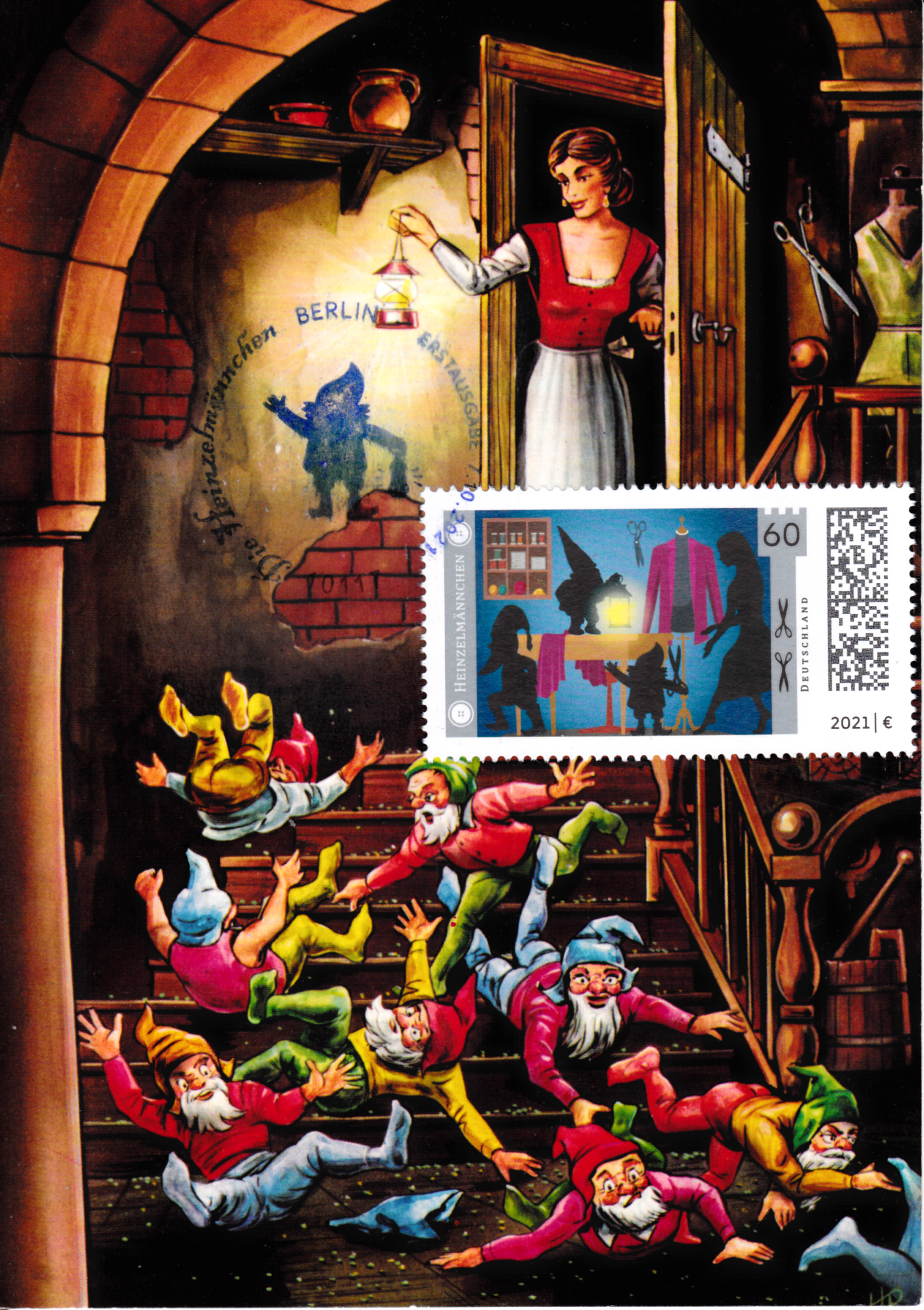 Maximumkarte mit der Marke mit den "Heinzelmännchen" und dem vom Motiv passenden Ersttagsonderstempel aus Berlin (der leider auf dem dunklen Hintergrund kaum zu erkennen ist).
