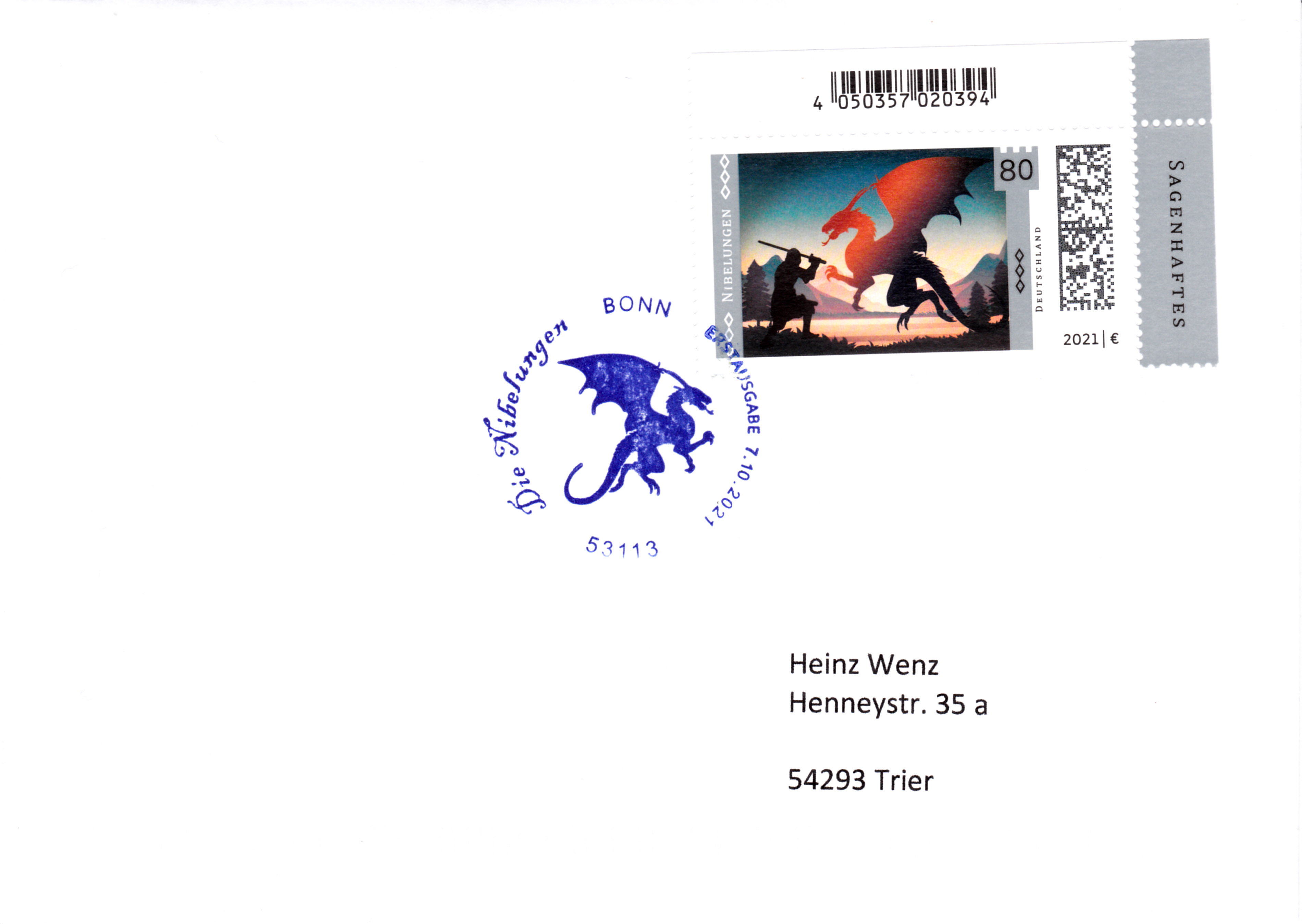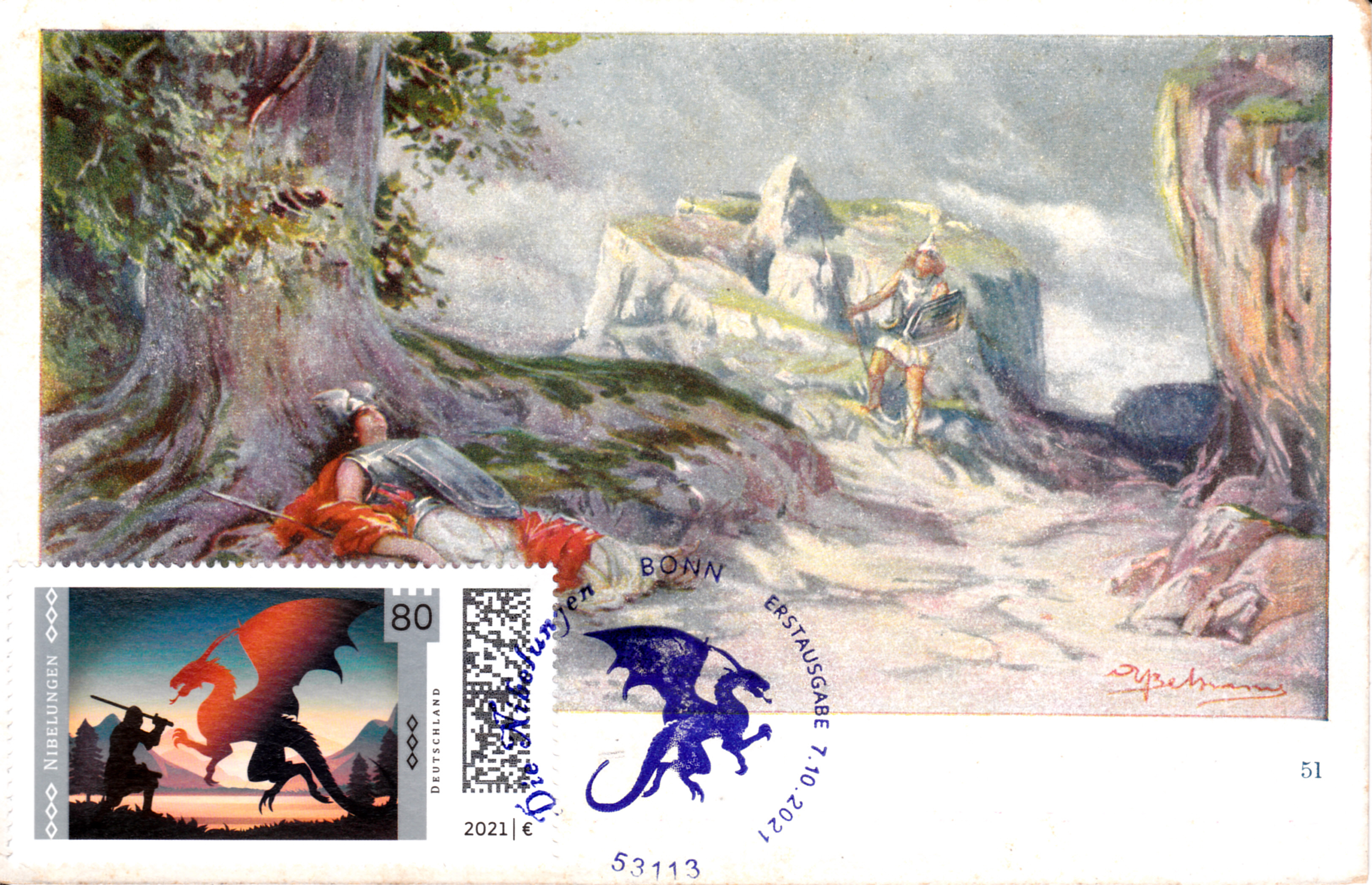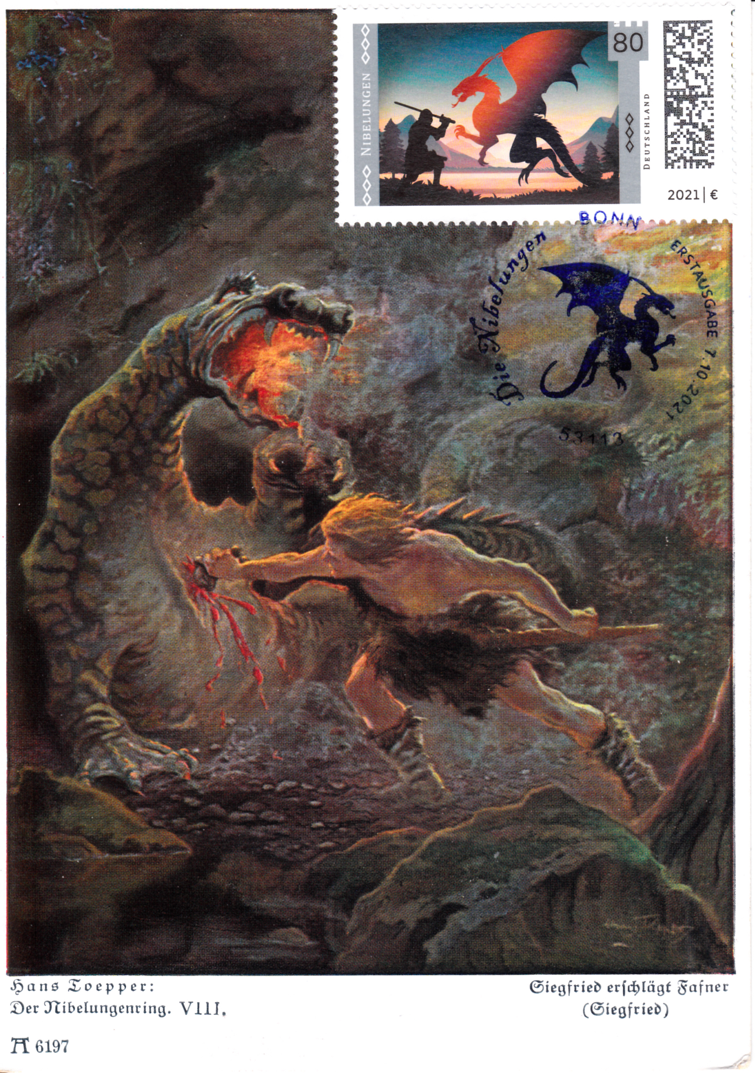 In der Serie "Sagenhaftes Deutschland" ist diese Marke (MiNr 3632) mit der Darstellung "Siegfried erschlägt Fáfnir" (den Drachen).