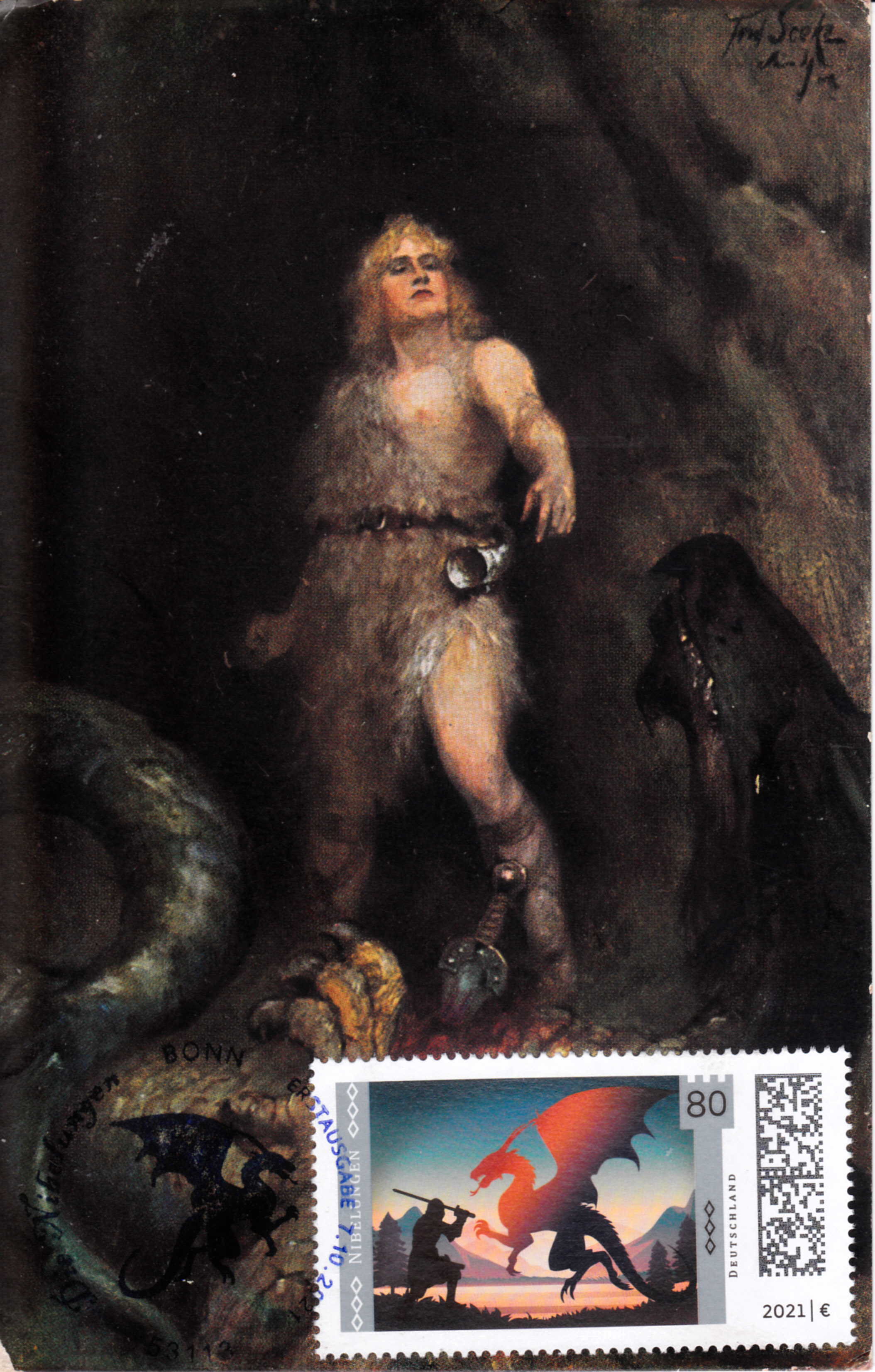 Und gleich noch eine andere Karte einer Darstellung des Kampfes von Siegfried mit dem Drachen mit Marke und Ersttagsonderstempel Bonn als Maximumkarte "verarbeitet".