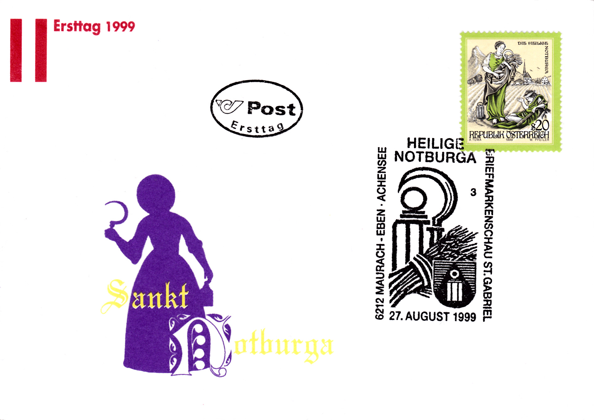 FDC mit dieser Marke und einem passenden Tagesstempel aus Maurach. Maurach am Achensee ist der Hauptort der Gemeinde Eben am Achensee und kommt in der Sage vor. Notburga war dort bei einem Landmanne in Dienst.