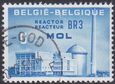 Auf dieser Marke (MiNr 1255) aus dem Jahre 1961 ist der Kernreaktor BR 2 zu sehen. Der Baubeginn für den leichtwassergekühlten Reaktor mit einer thermischen Leistung von 100 MW war am 1. Januar 1958. Er konnte am 29. Juni 1961 in Betrieb gehen.