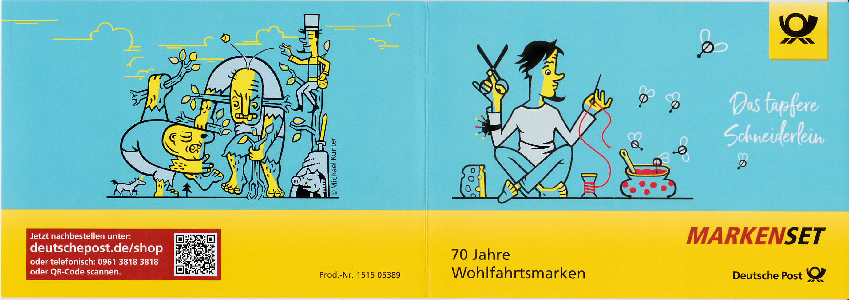 Die Wohlfahrtsmarken 2019 der Deutschen Post erschienen mit Motiven zum Märchen "Das tapfere Schneiderlein". Hier zunächst die Marke zu 70 + 30 Cent mit der Darstellung "In der Schneiderstube" als Eckrandstück mit EAN-Code:
