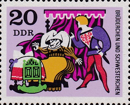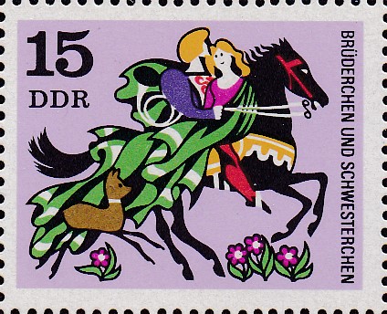 Auf dieser Marke aus der DDR (MiNr 1545) sehen wir die beiden bei der dritten Quelle, an der "Brüderchen" trinkt. Zwischen den Bäumen wird die Hexe gezeigt.