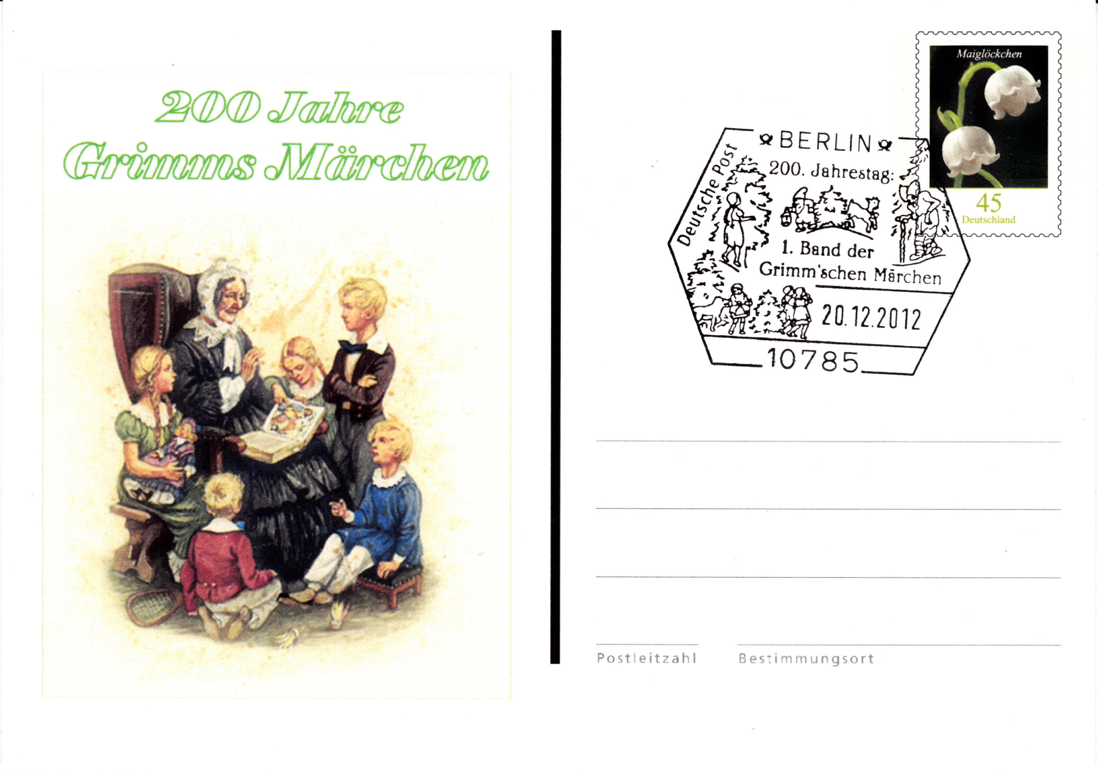 Sonderstempel vom 20.12.2012 zum 200. Jahrestag des 1. Bandes der Grimm'schen Märchen auf einer sogenannten "Blanko-Postkarte" mit dem Wertstempel Maiglöckchen (MiNr P189) mit einem Zudruck zu "200 Jahre Grimms Märchen".
