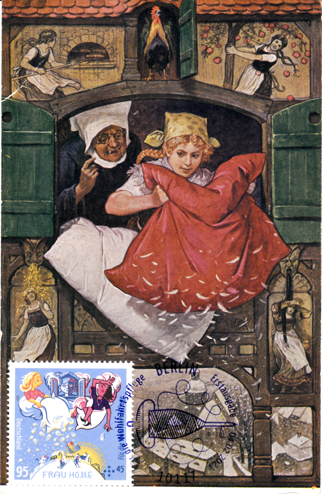 Farbige Ministerkarte des Finanzministers mit je einer Marken der Wohlfahrtsmarkenserie 2021 (MiNr 3585 bis 3587) mit Motiven zum Thema "Frau Holle". Zwei Marken sind mit den Ersttagsonderstempel Berlin gestempelt und eine Marke erhielt den Ersttagsonderstempel Bonn.
