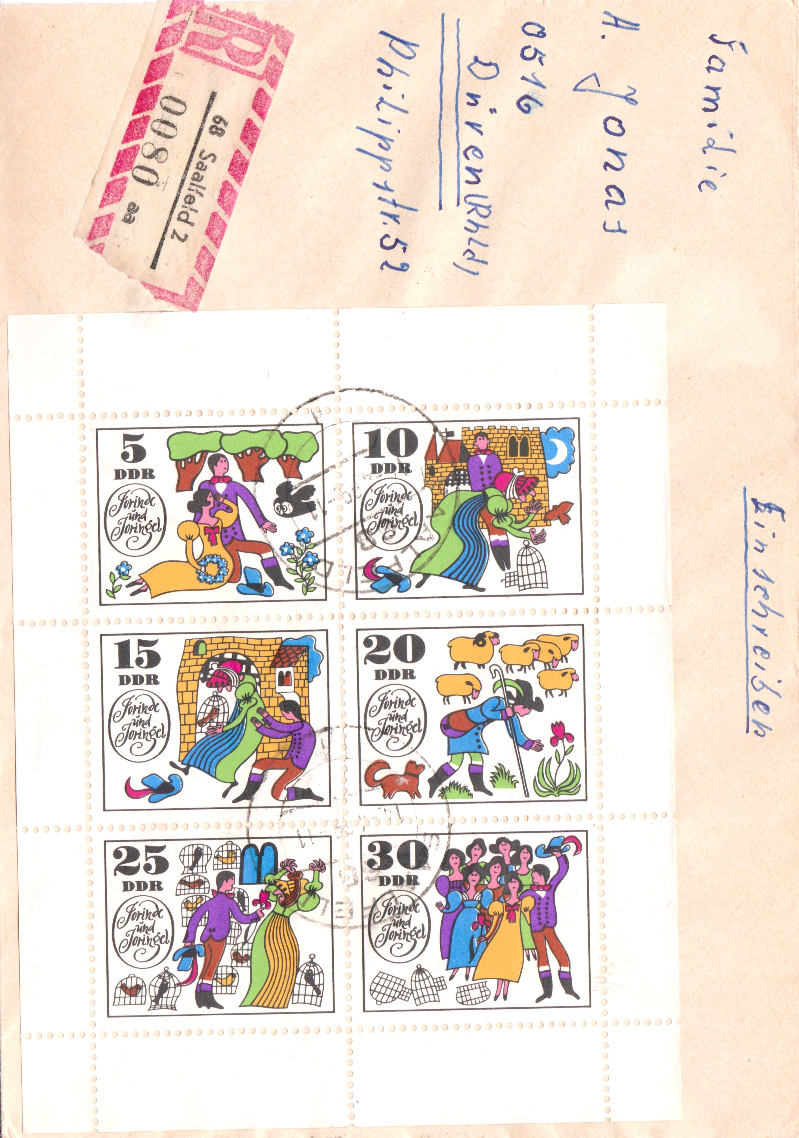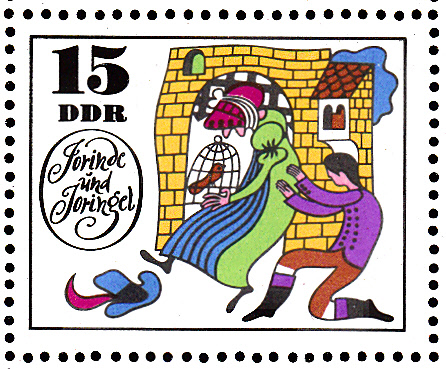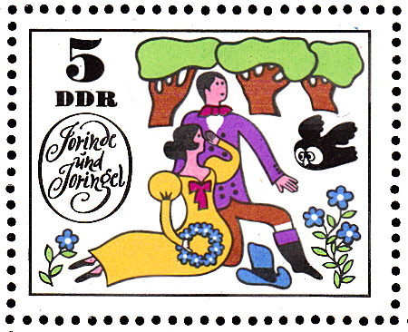 Diese Marke aus der DDR (MiNr 1450) zeigt Jorinde und Joringel im Wald und die Zauberin als Eule.