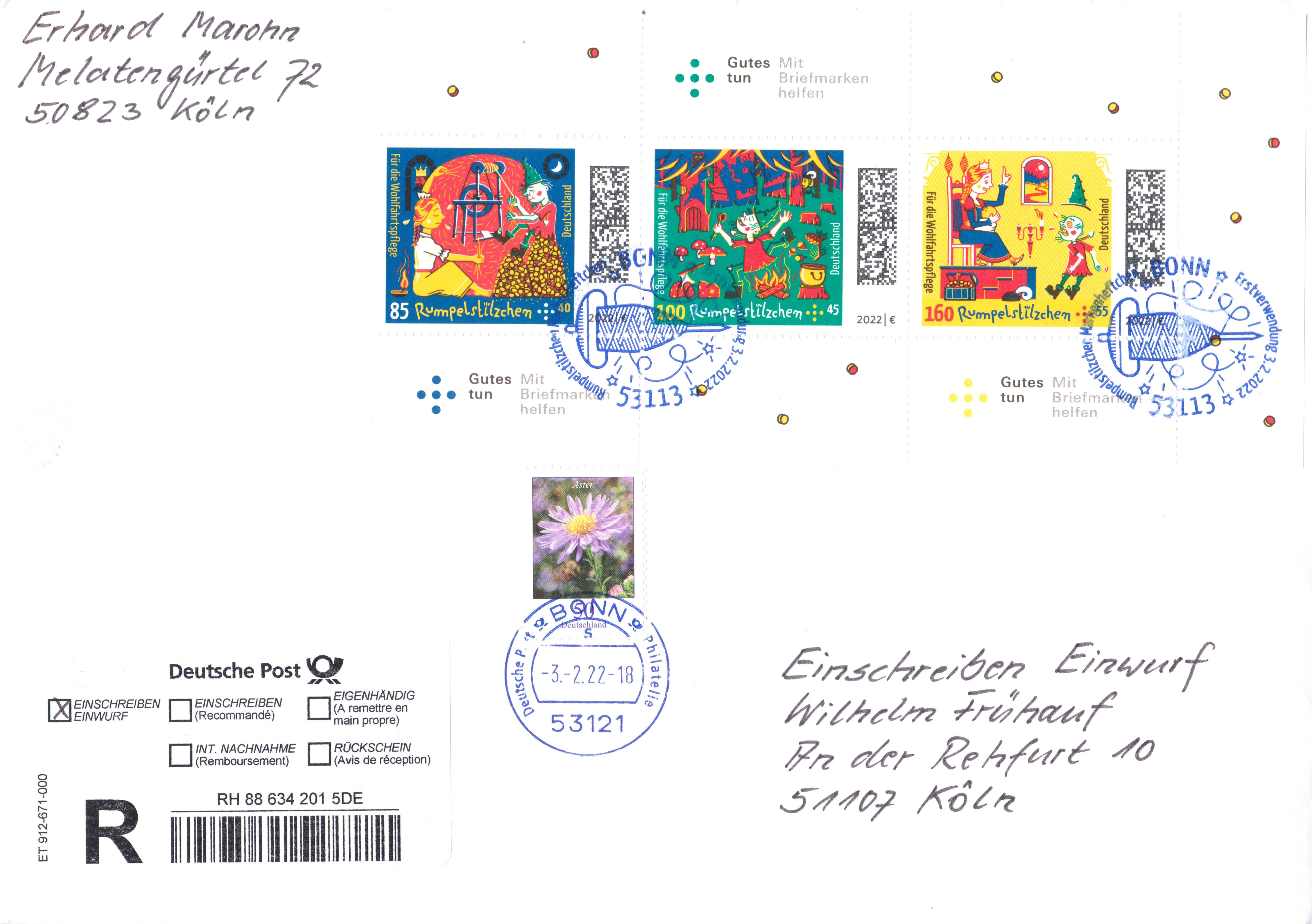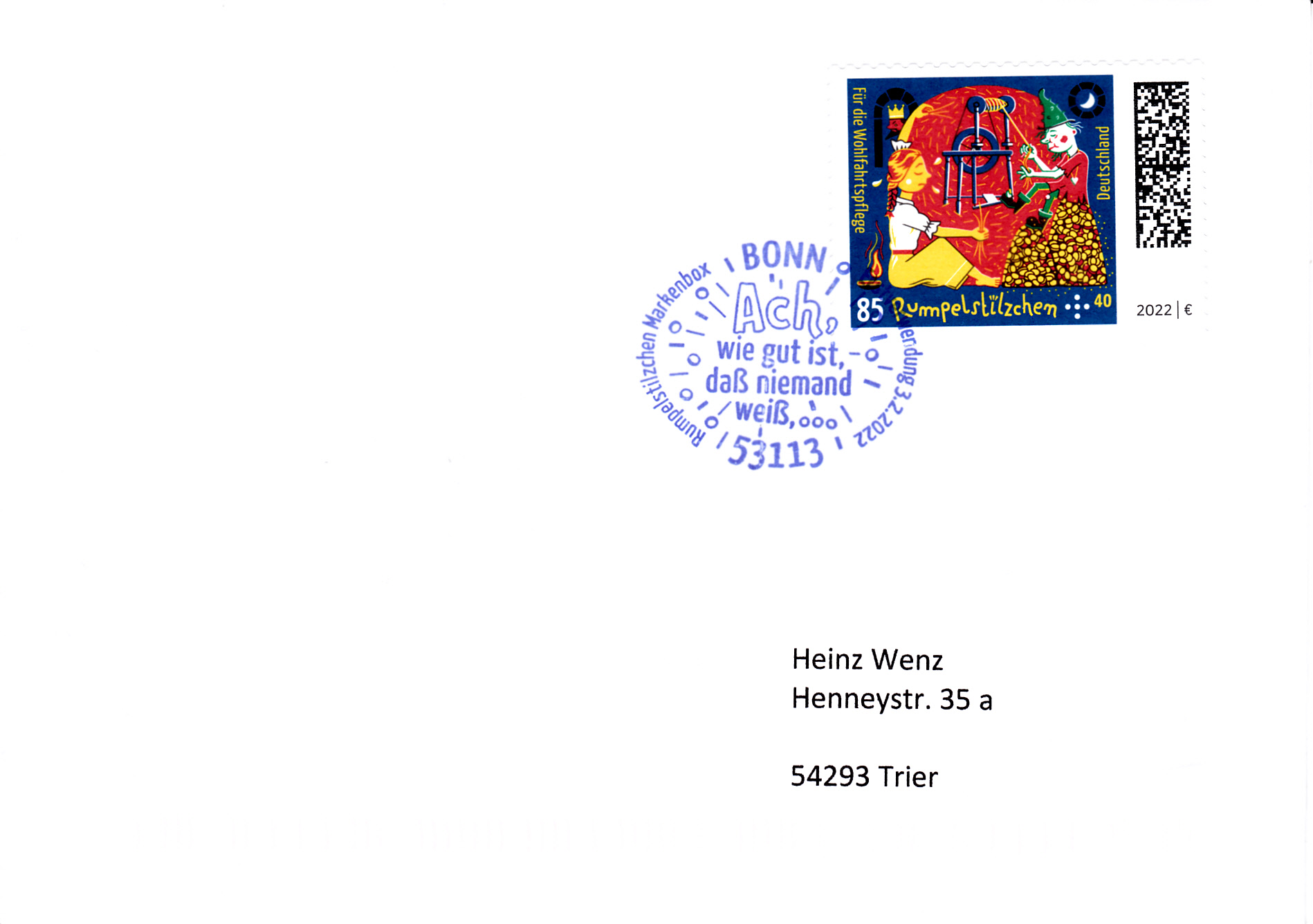 Für die selbstklebende Marke aus der Markenbox (=Rollenmarke) wurde ein Erstverwendungsstempel Bonn eingesetzt.