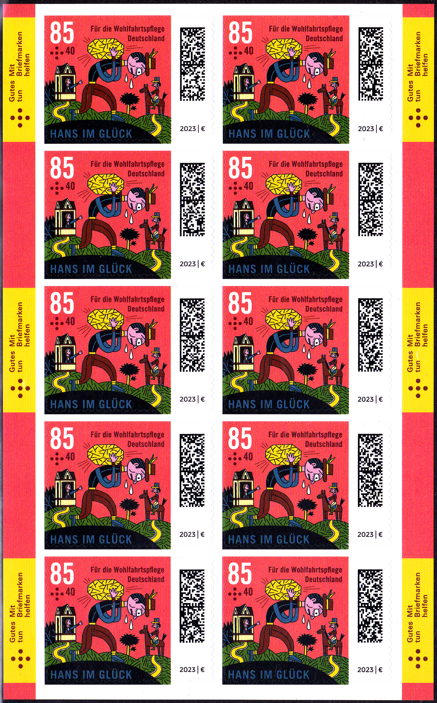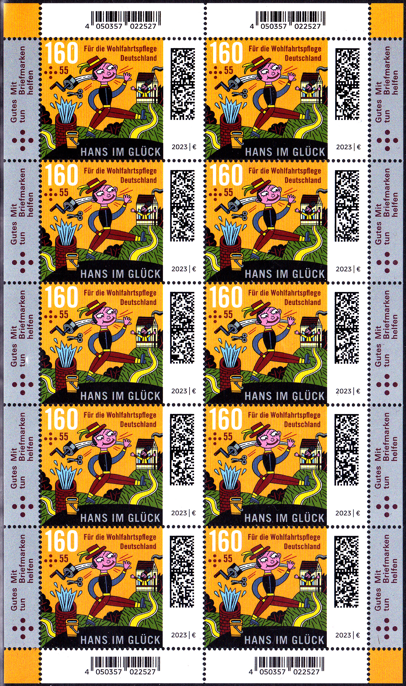 Die Wohlfahrtsmarken 2023 der Deutschen Post zeigen Szenen zu "Hans im Glück". Auf der Marke zu 85+40 Cent (MiNr 3745) sehen wir wie Hans schwitzend seinen Goldklumpen vom Dienstherr zu einem Pferd mit Reiter schleppt.