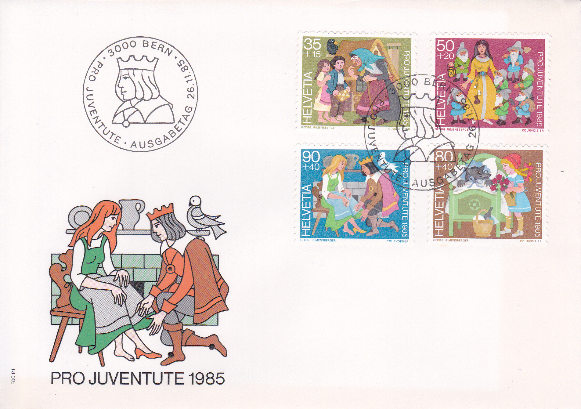 Auf diesem FDC wurden alle vier Marken der Serie mit Märchenmotiven verklebt.