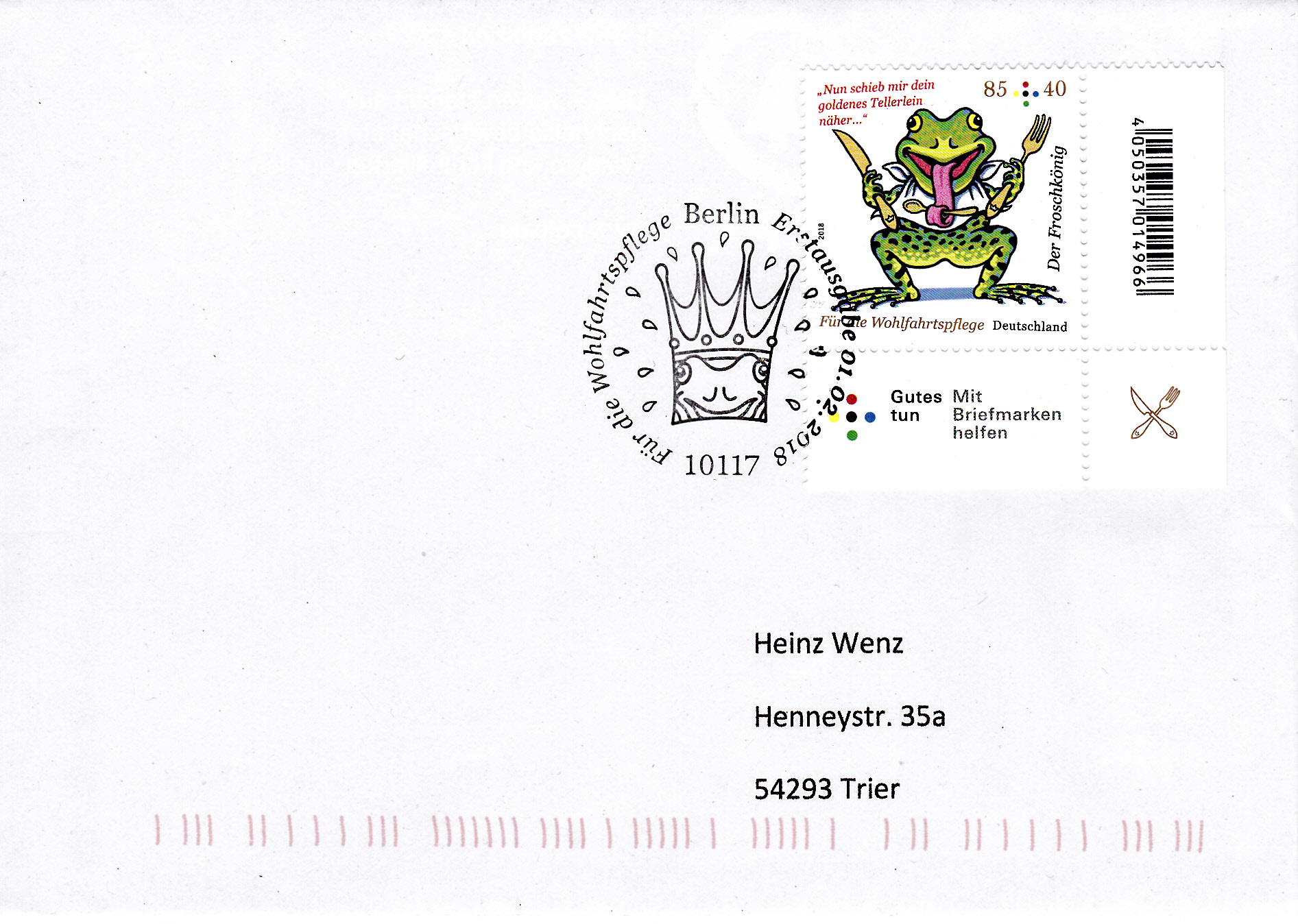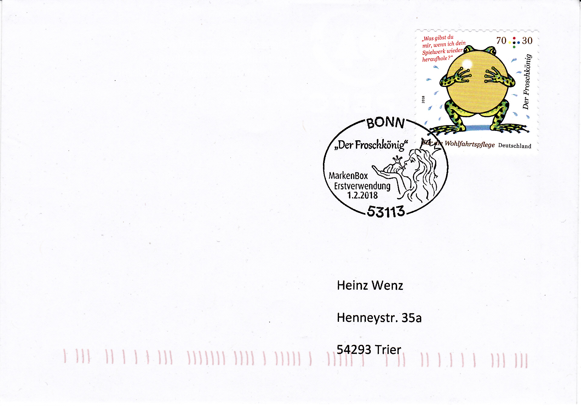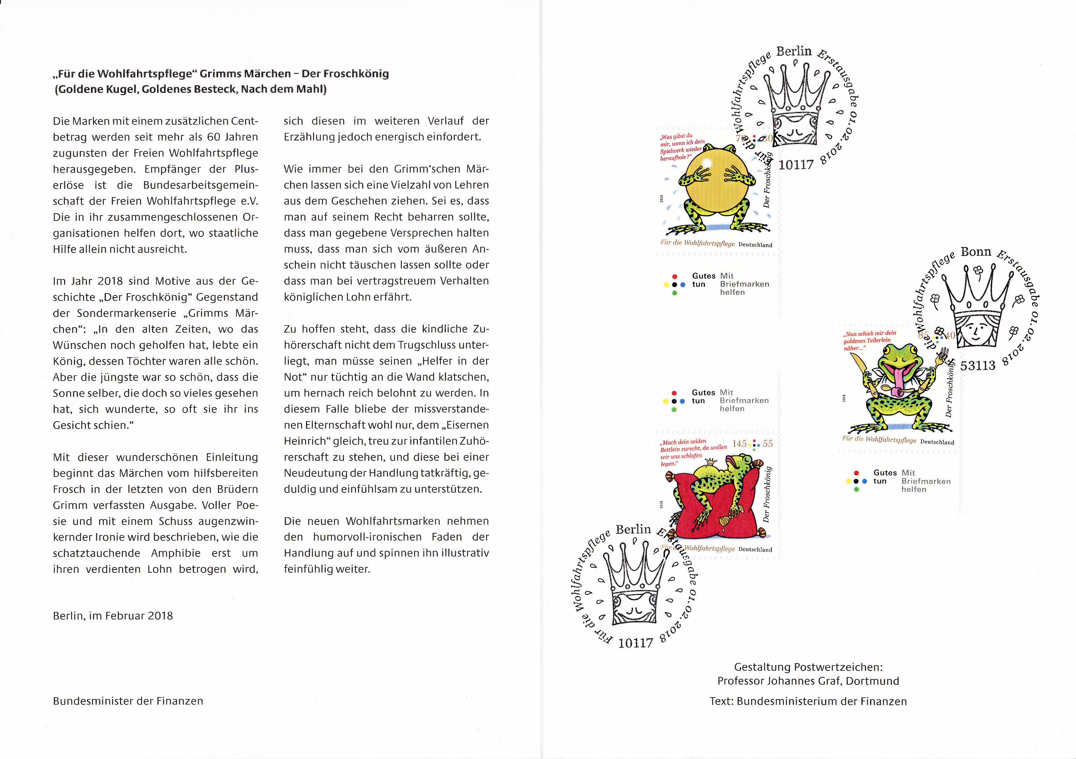 Es folgt die Ministerkarte des Finanzministers mit den gezeigten Wohlfahrtsmarken 2018 mit den Motiven zum Märchen "Der Froschkönig" mit den beiden Ersttagsonderstempel Bonn und Berlin.