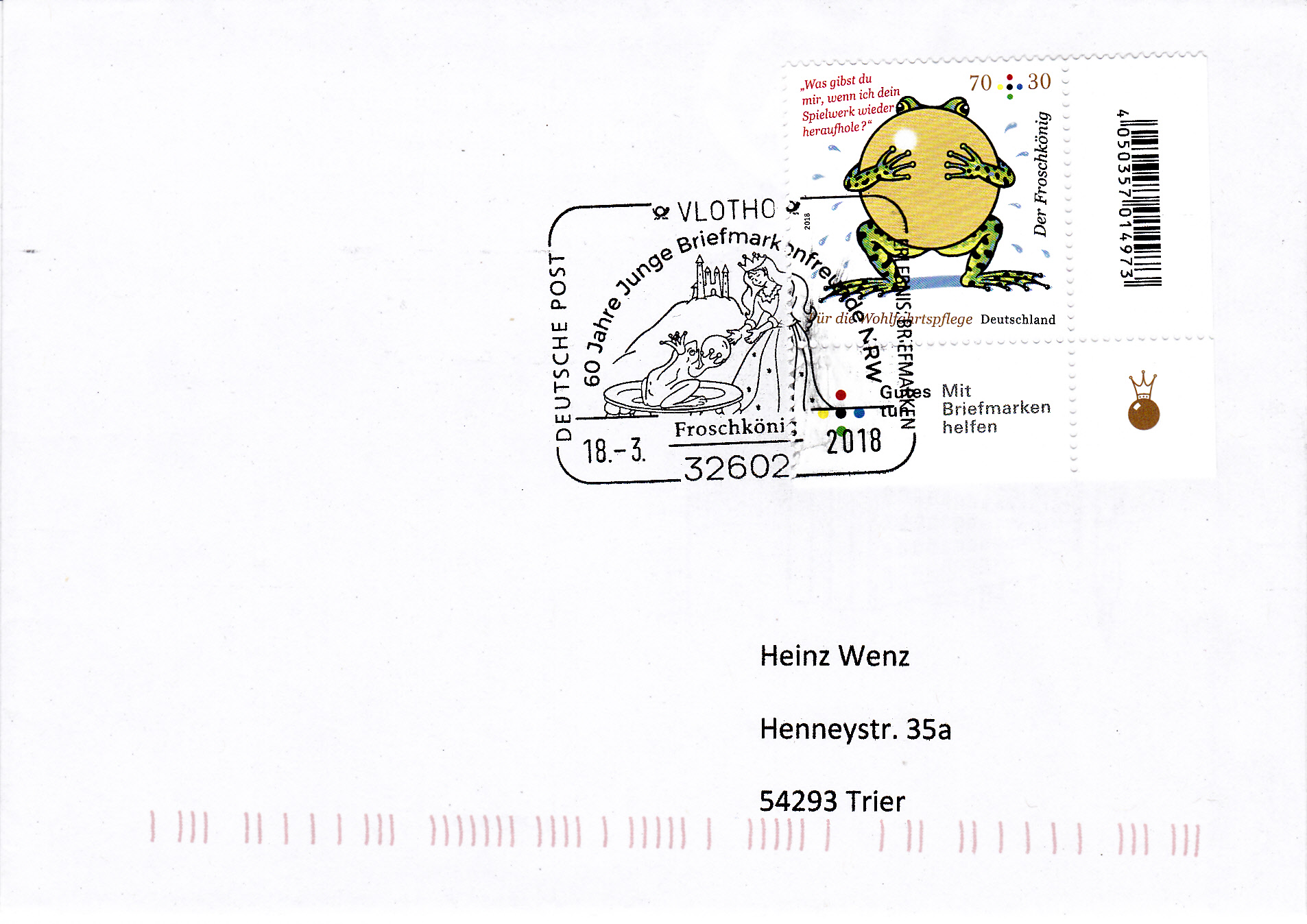 Im Sonderstempel vom 18.3.2018 aus Vlotho zum 60. Geburtstag der Jungen Briefmarkenfreunde in NRW übergibt der Froschkönig die Goldenen Kugel an die Prinzessin.