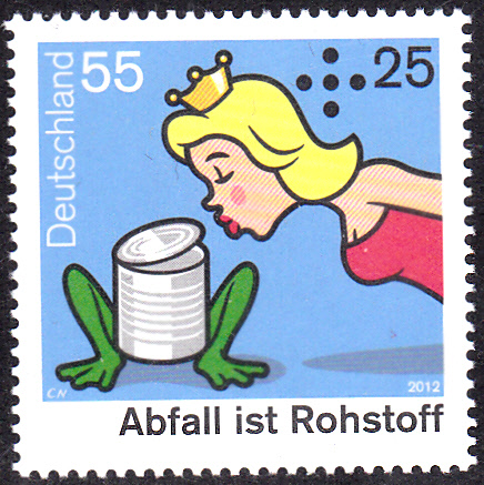 Das Märchen "Der Froschkönig" diente dem Entwerfer dieser Marke zum Umweltschutz und dem Thema "Abfall ist Rohstoff" als Idee für seinen Markenentwurf. Er zeichnete eine Szene aus dem Märchen "Froschkönig" mit einer Konservendose als Frosch.