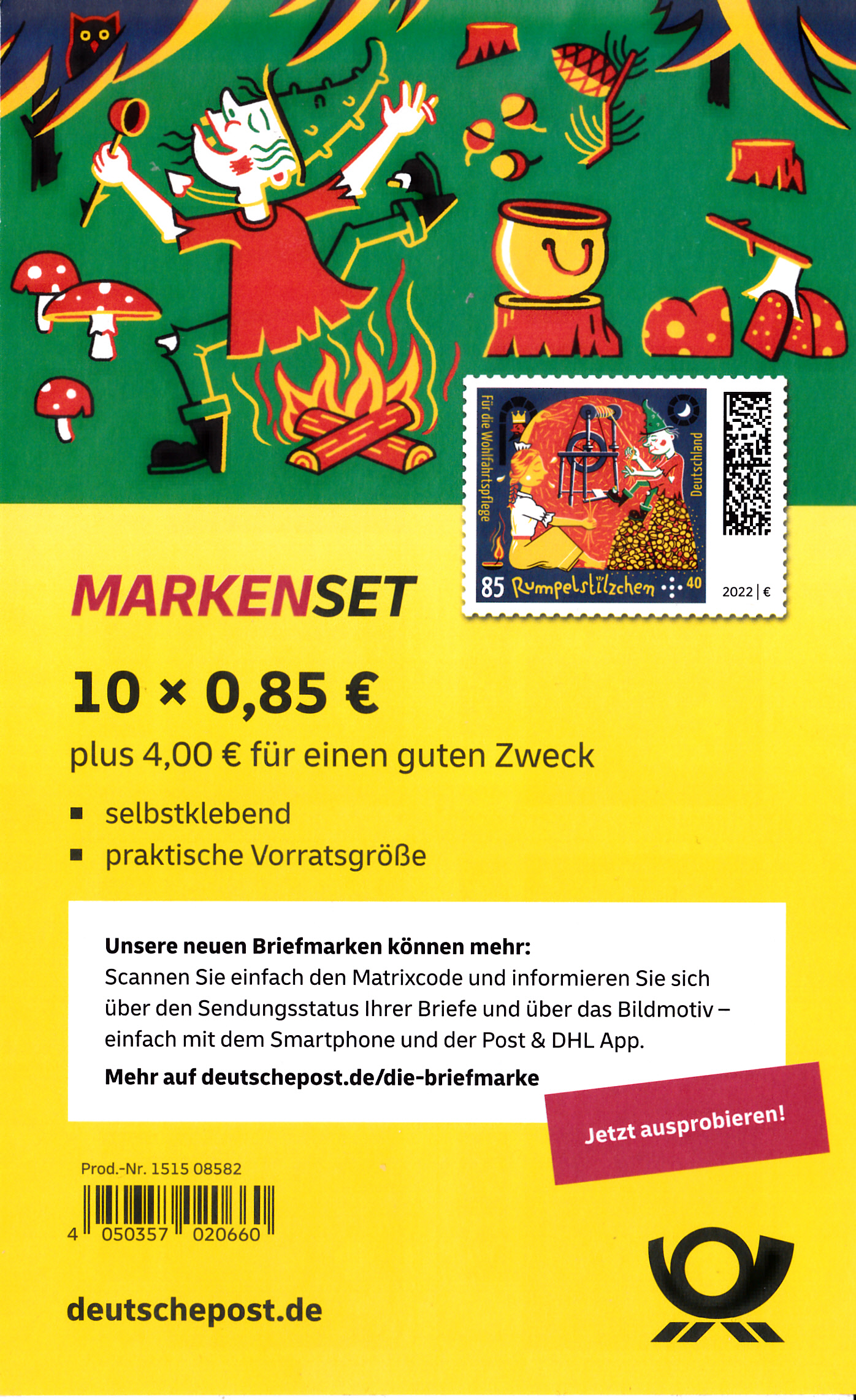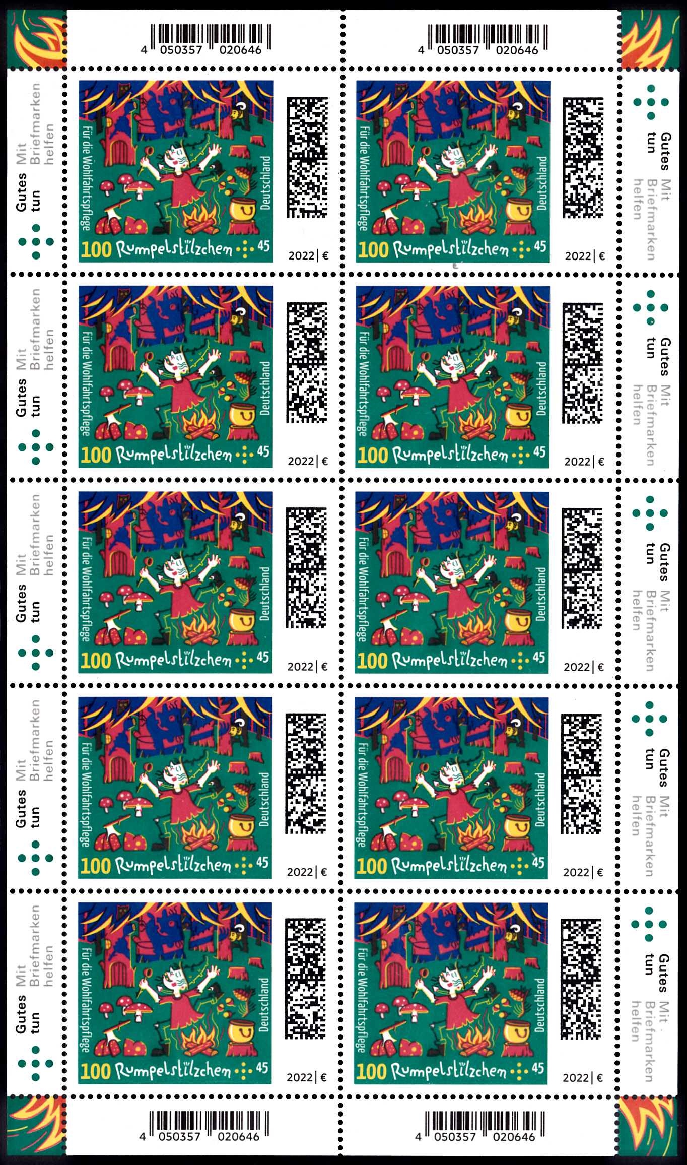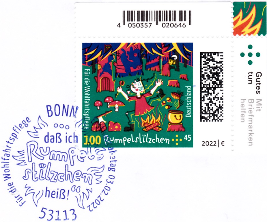 Auf der Marke zu 100+45 Cent (MiNr 3665) wird die Abbildung "Rumpelstilzchen tanzt um Feuer" gezeigt.